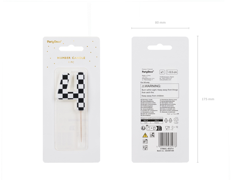 Lumanarea este modelată în cifra 4 și este decorată cu un model de drapele în carouri, adăugând un element sportiv și plin de viață la petrecerea de aniversare. Cu o înălțime aproximativă de 5.5 cm, această lumanare este potrivită pentru a fi amplasată pe torturile de dimensiuni medii și mari.