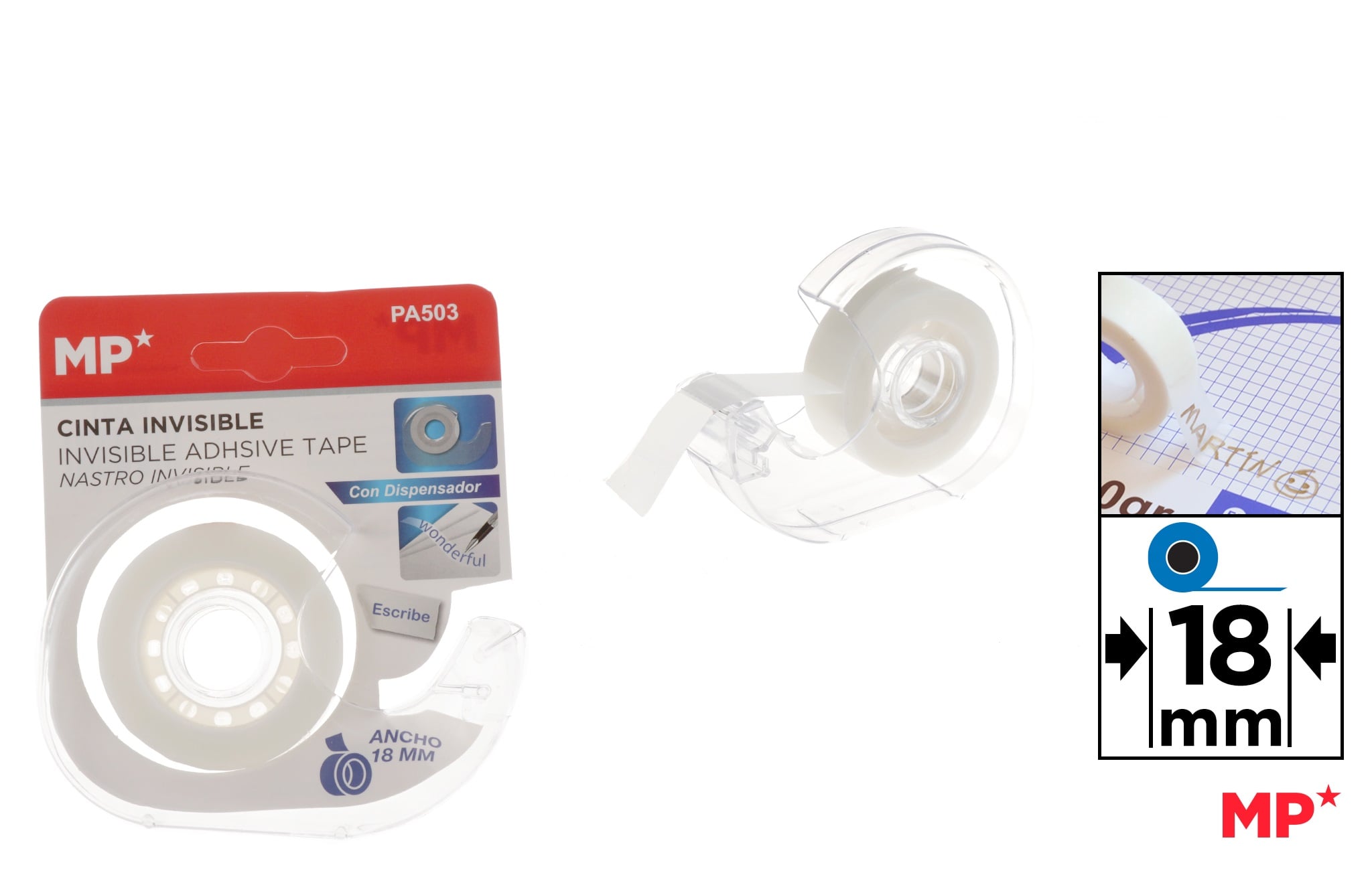 Invisible adhesive tape with plastic dispenser. Strongand easy to cut. Writable on top of it. It doesnot appear on photocopies and leaves no trace ondocuments. Great adhesion, ideal for sticking paper,cardboard, for crafts, for use in the officeandat home. 18 mm x 30 m roll. Blister of 1 unit.