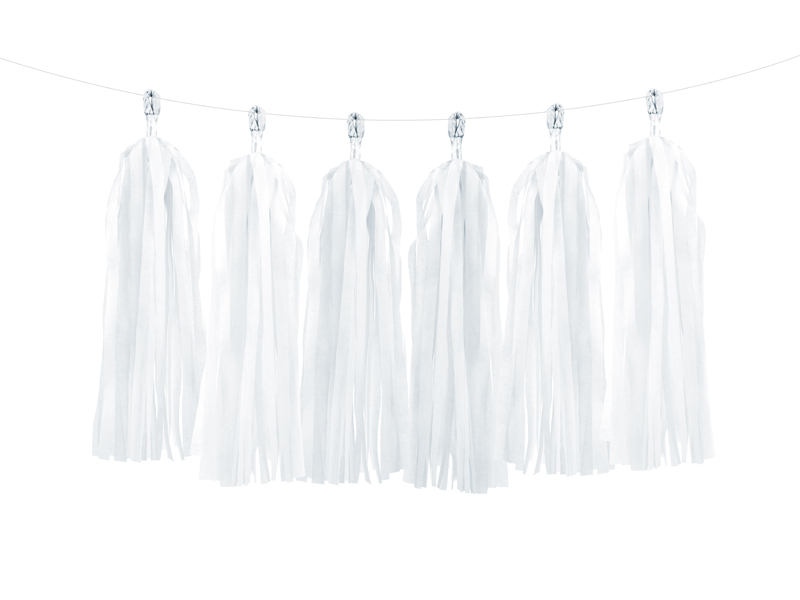 Tassel garland, do it yourself, set contains 12 tassels in colour of white and approx. 2 m of white twine, sizes after assembling: height approx. 30 cm, length approx. 1.5 m. 1 pkt / 1 pc. symbol: TG1-008