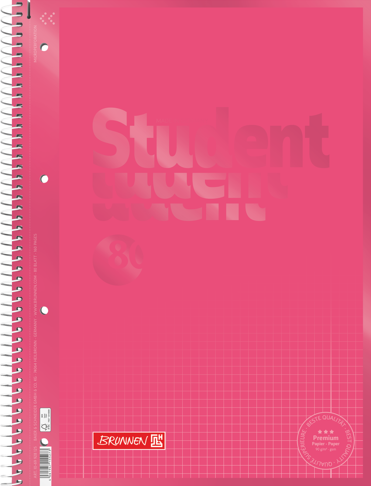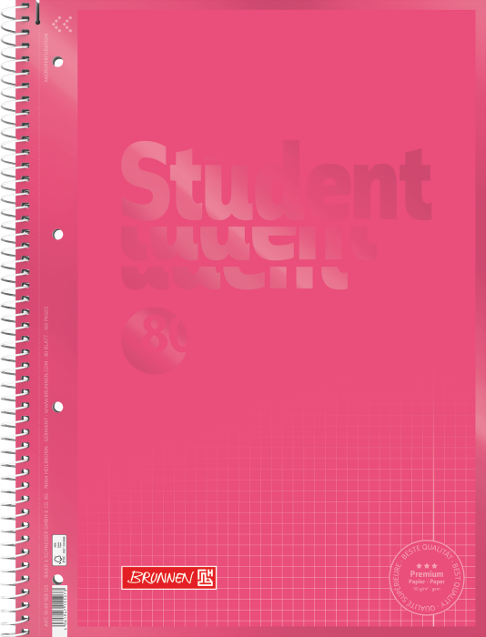 Caietul A4 Brunnen Tulip matematică (cod 69928125) este un caiet cu spiră metalică fabricat de Baier & Schneider GmbH Germania, cu format A4, 80 de file de 160 pagini cu gramaj de 90 g/mp hârtie satinitată alb strălucitor, liniatură Lin. 28 cu pătrățele de 5 mm și margini duble interior și exterior, copertă în nuanța Tulip roșu lalea cu efect mat-lucios tactil, microperforații cu bandă detașabilă, 4 perforații standard pentru arhivare și certificare FSC MIX, disponibil pe ipb.ro. Față de modelul Brunnen Tulip dictando disponibil pe ipb.ro, diferența esențială este liniatura, Lin. 28 cu pătrățele 5 mm față de Lin. 27 dictando cu margine dublă, ambele incluzând margini duble interior și exterior. O diferență tehnică notabilă este sistemul de detașare, banda detașabilă suplimentară față de microperforațiile cu ajutor detașare ale modelului dictando, banda oferind un ghidaj fizic suplimentar pentru ruperea perfect dreaptă a filelor. Toate celelalte specificații, gramajul de 90 g/mp, coperta Tulip mat-lucios, Double Wire, 4 perforații și certificarea FSC MIX, sunt identice la ambele modele Tulip.