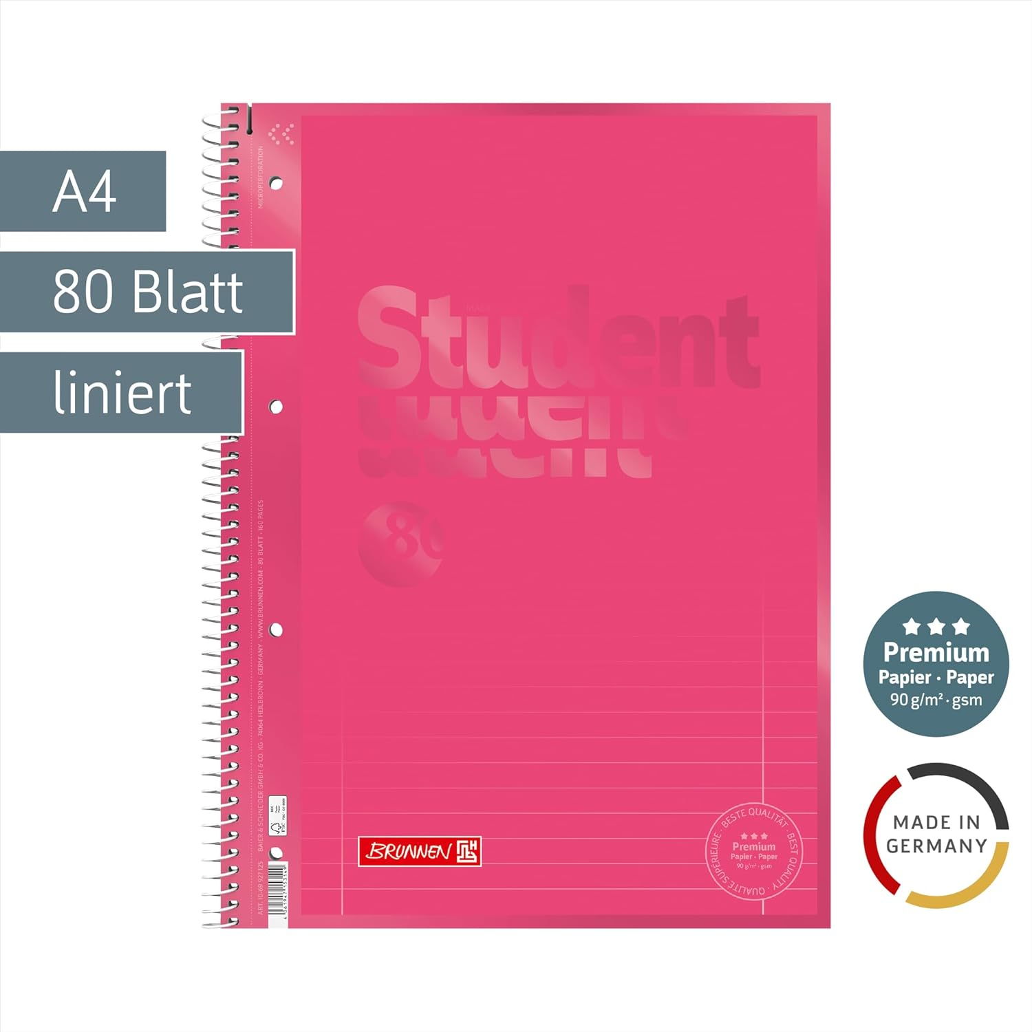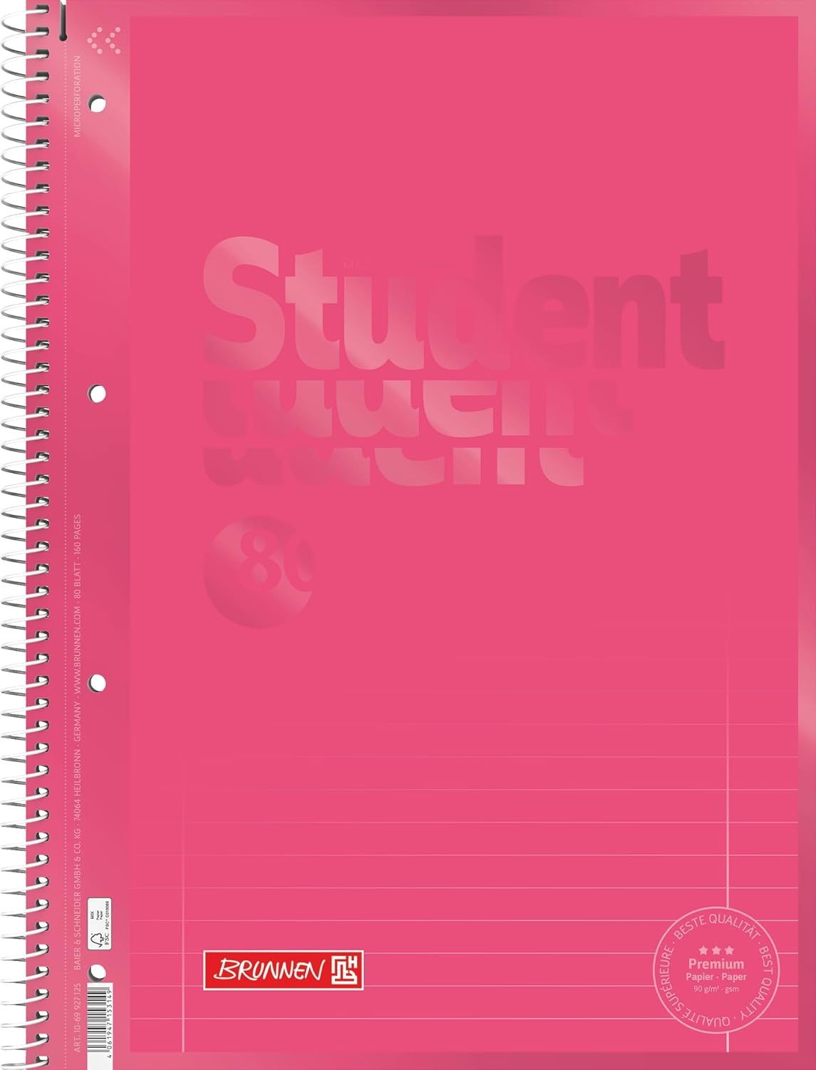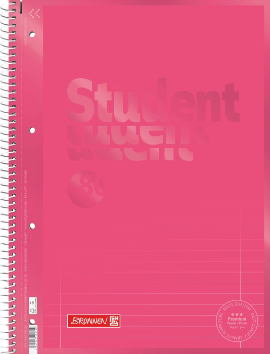 Caietul A4 Brunnen Tulip este un caiet cu spiră metalică dublă Double Wire fabricat de Baier & Schneider GmbH Germania, cu format A4 de 29,9 x 22,8 cm, 80 de file de 160 pagini cu gramaj de 90 g/mp hârtie satinitată alb strălucitor, liniatură Lin. 27 dictando cu margine dublă interior și exterior, copertă în nuanța Tulip roșu lalea cu efect mat-lucios tactil, microperforații cu sistem de ajutor detașare, 4 perforații standard pentru arhivare, certificare FSC MIX și greutate de 524g, disponibil pe ipb.ro. Față de modelul Brunnen Pastel Soft-Touch 6932796 disponibil pe ipb.ro, specificațiile tehnice de hârtie 90 g/mp, liniatura Lin. 27 cu margine dublă, sistemul Double Wire, microperforațiile și certificarea FSC MIX sunt identice, diferind prin finisajul coperții, efect mat-lucios tactil față de Soft-Touch catifelat, culoarea coperții, roșu lalea vibrant față de roz și mentă pastel și formatul ușor mai generos de 29,9 x 22,8 cm față de 29,7 x 22,2 cm. Ambele modele reprezintă vârful gamei Brunnen disponibile pe ipb.ro.