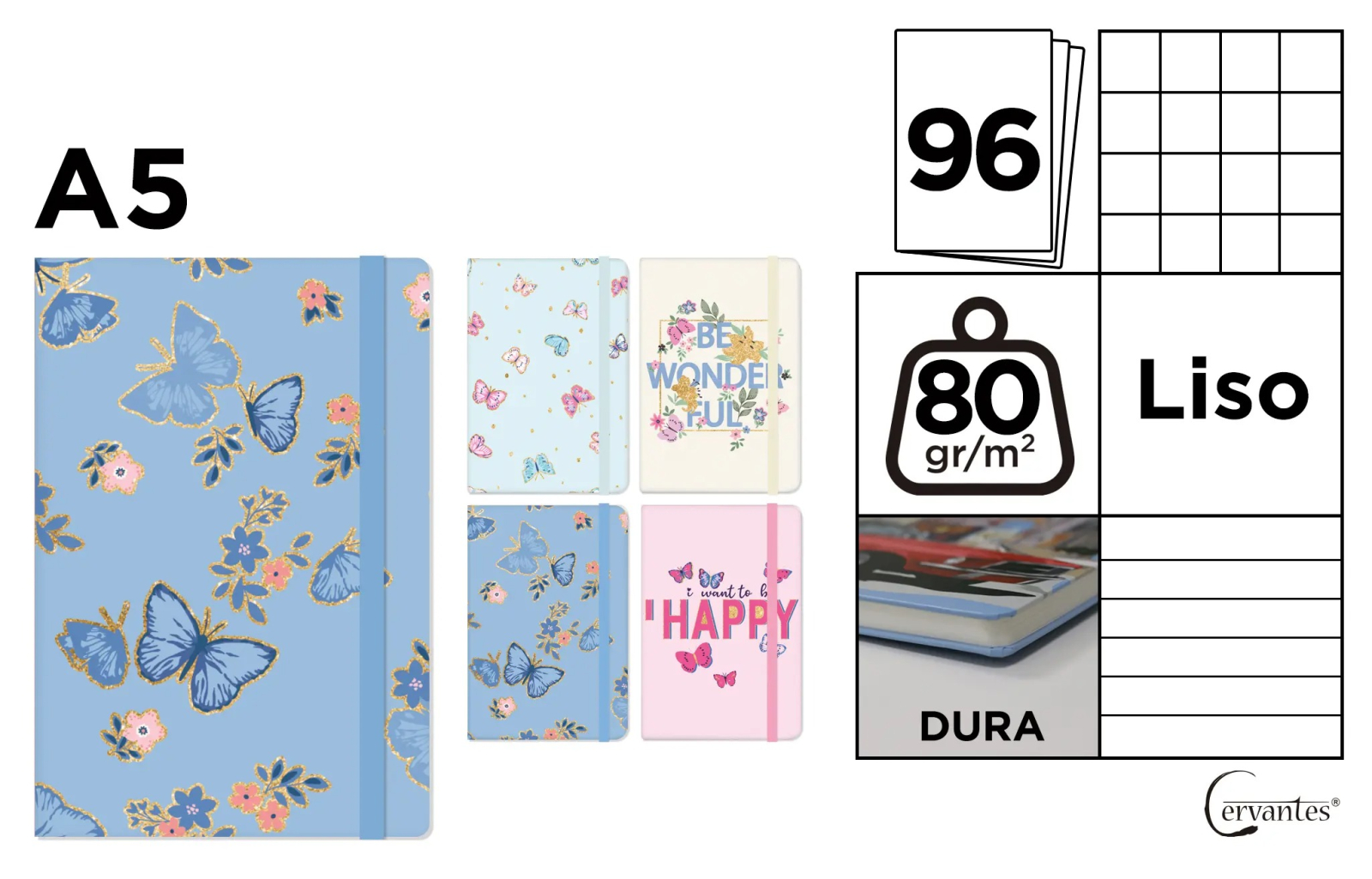 NOTES IPB A5 CERVANTES CU ELASTIC PB829-78 – Caiet de notițe în format A5, cu copertă vibrantă decorată cu motive de fluturi și citate motivaționale, prevăzut cu elastic pentru menținerea conținutului în siguranță.