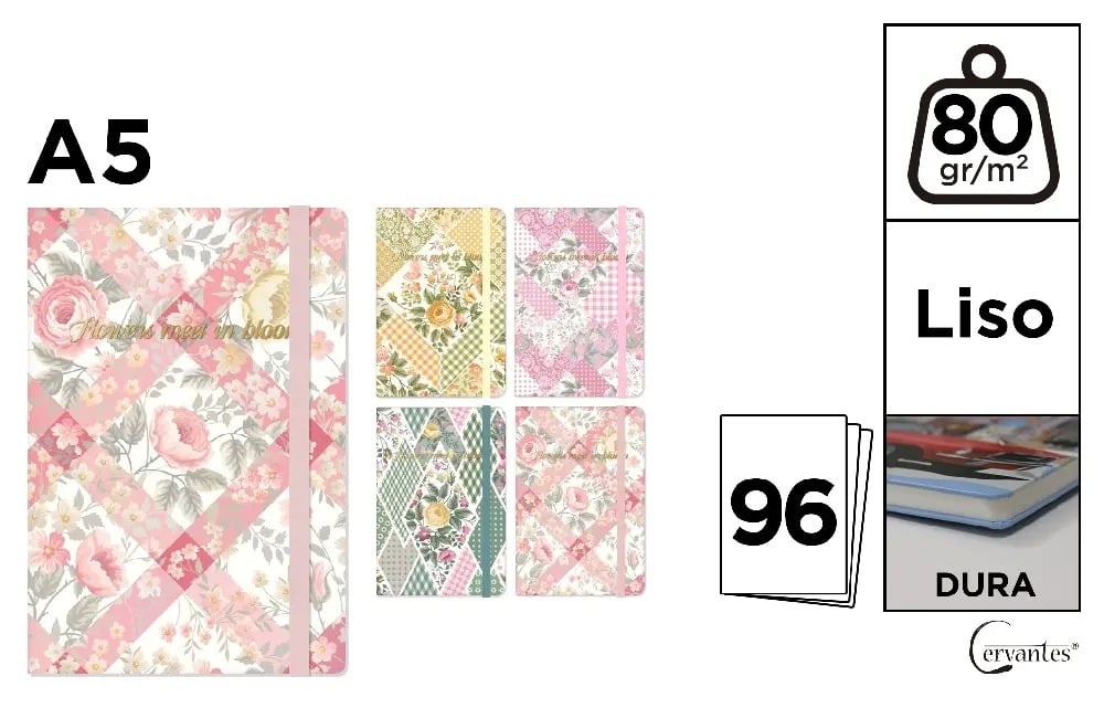 Etichete: CU ELASTIC, CERVANTES, 96 file, Copertă Dură, Bloom Flowers, Imprimeuri florale, Papetărie elegantă, Școală și birou, caiet A5, notes