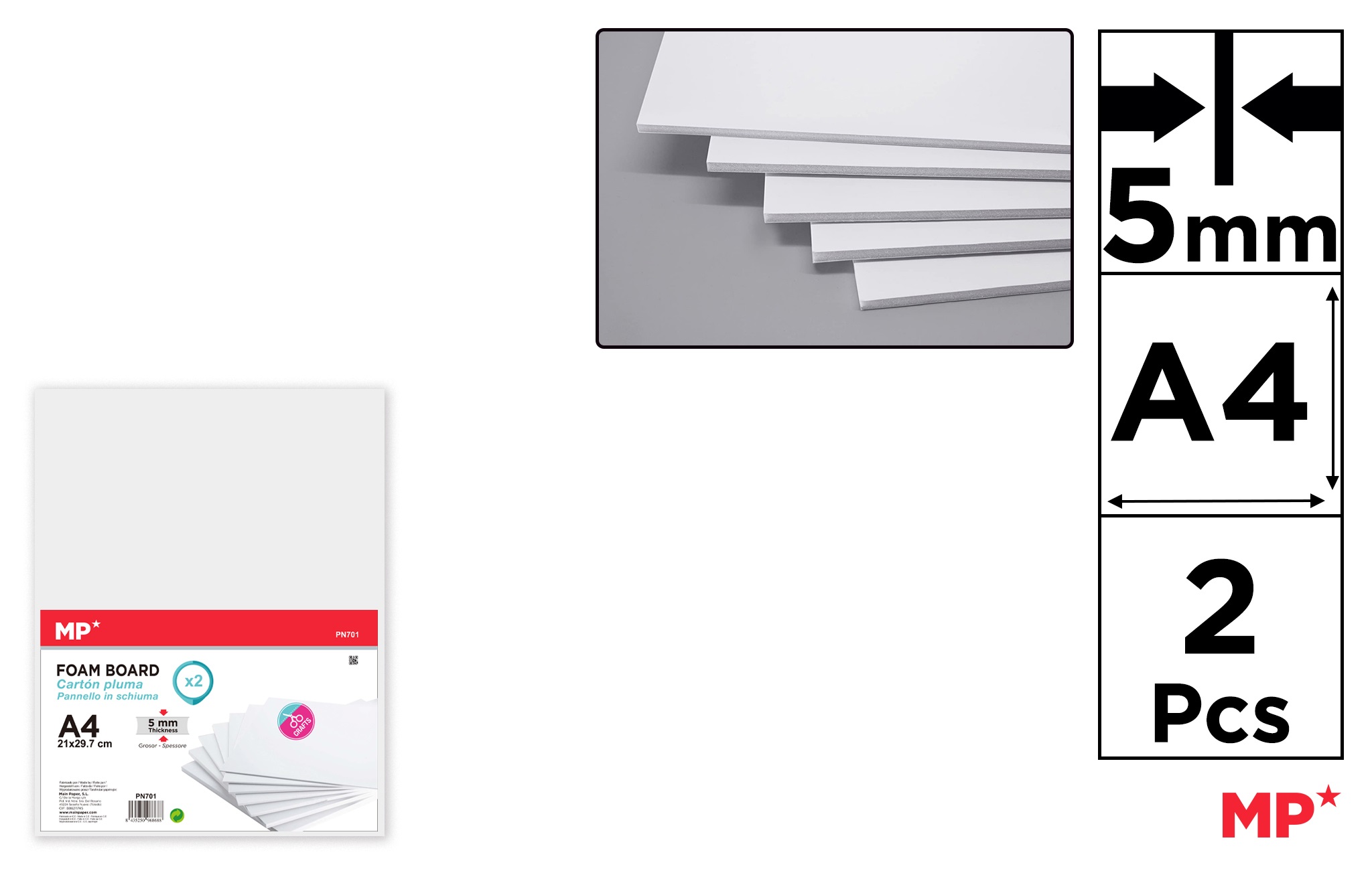 Foam board made of light polyurethane foam withtwosides of cardboard. Great rigidity and verylight.Perfect for mockups and as a support forimages.You can cut, paste and click on it.Thickness:5 mm. A4 size. Measurements: 210 x 297mm.White colour.