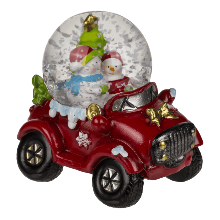 Acest glob de zăpadă aduce o notă modernă și veselă decorului de Crăciun. Elementul distinctiv este baza din polirășină, care reprezintă o mașină roșie decorată cu detalii festive, pe care este așezat globul. Globul conține figurine tematice de Crăciun și sclipici fin care plutește, creând un efect de "zăpadă" magică.