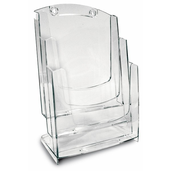 Suportul ARDA A4 (70A43) cu 3 compartimente oferă o organizare eficientă și vizibilitate maximă pentru materiale publicitare sau documente, fiind ideal pentru expunerea simultană a diferitelor broșuri, pliante sau liste de prețuri, atât pe birou, cât și montat pe perete, contribuind la prezentarea clară și atractivă a informațiilor.
