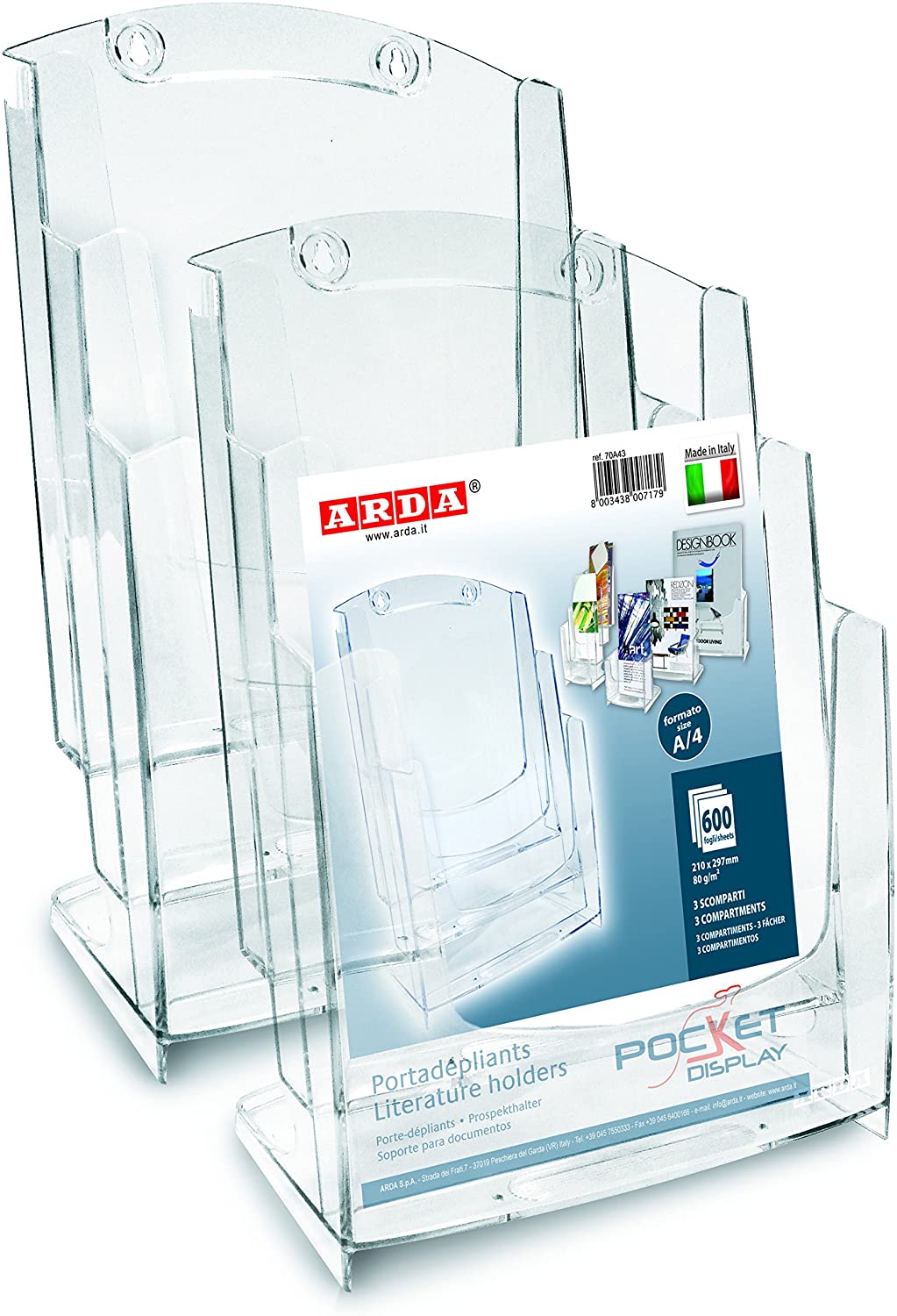 Acest port-depliant (Portadepliant) de la Arda (Model 70A43) este o soluție excelentă pentru a expune și a organiza o varietate de materiale publicitare în format A4 ($21 times 29,7$ cm).