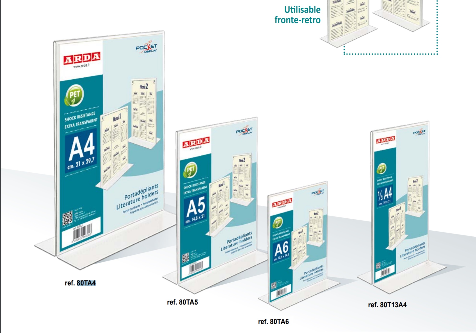 Acest suport de afișare de la Arda, Italia (Model 80TA6) este un sistem de prezentare elegant și eficient, ideal pentru a afișa materiale informative în format A6. Datorită formei sale de Tip T, asigură o vizualizare stabilă și clară a pliantelor pe orice suprafață orizontală.