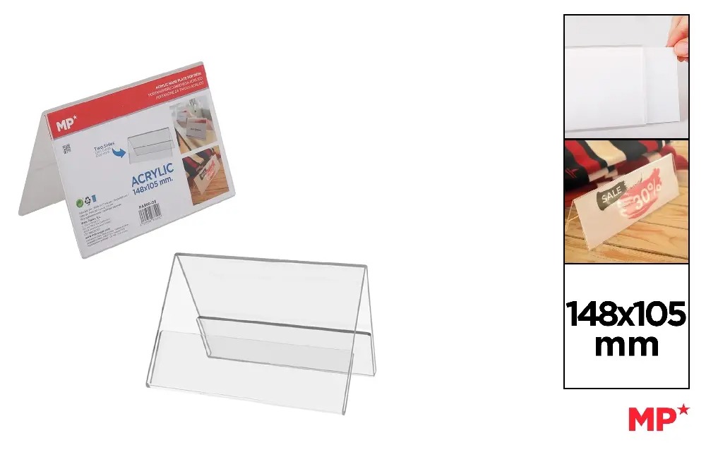 Acest suport de dimensiuni 148 x 105 mm este ideal pentru afișarea numelui sau a prețului în diverse contexte, fie că este vorba despre evenimente, prezentări, sau pe rafturile magazinelor. Realizat dintr-un material transparent și durabil, acest suport oferă o vizibilitate clară și permite inserarea și schimbarea rapidă a etichetelor sau a cardurilor cu numele sau prețul. Fiind prevăzut cu două fețe, acesta oferă posibilitatea de a afișa informații de pe ambele părți, fiind practic și versatil în utilizare. Poate fi folosit cu succes în diverse medii, de la birouri și expoziții, până la magazine și evenimente.