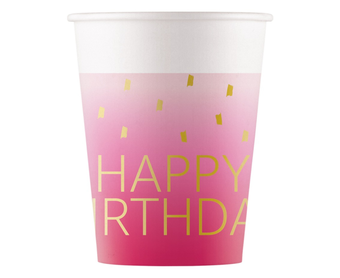 Paharele de hârtie Pink Happy Birthday, cu o capacitate de 200 ml, sunt un element elegant și festiv, decorate cu inscripția aurie „La mulți ani” și puncte aurii, perfect pentru orice petrecere de ziua de naștere.