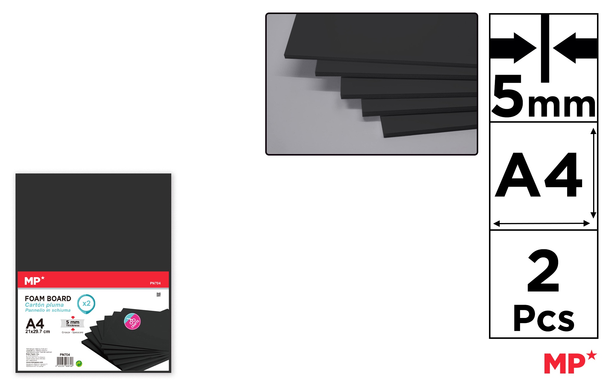 Foam board made of light polyurethane foam withtwosides of cardboard. Great rigidity and verylight.Perfect for mockups and as a support forimages.You can cut, paste and click on it.Thickness:5 mm. A4 size. Measurements: 210 x 297mm.Black colour.