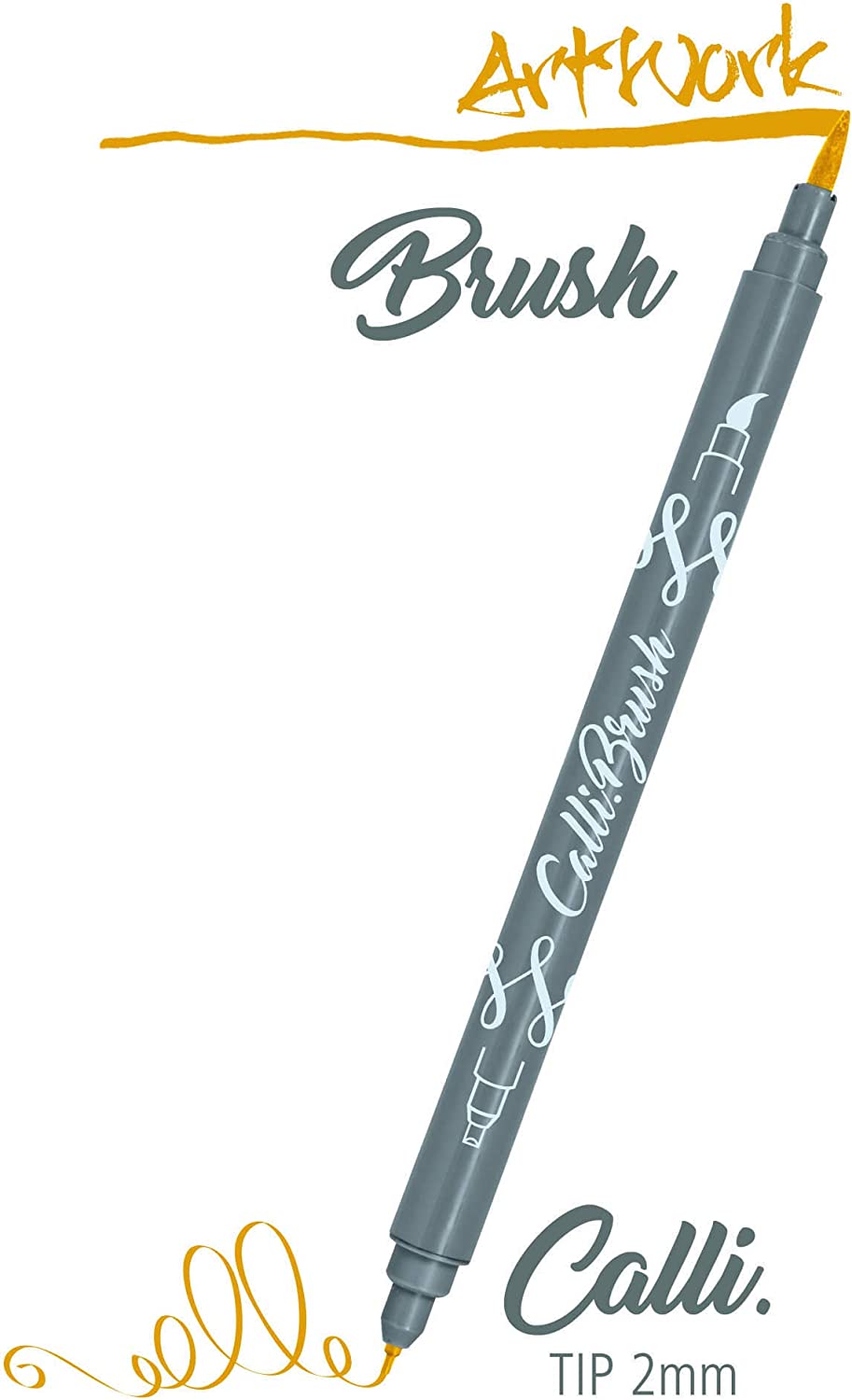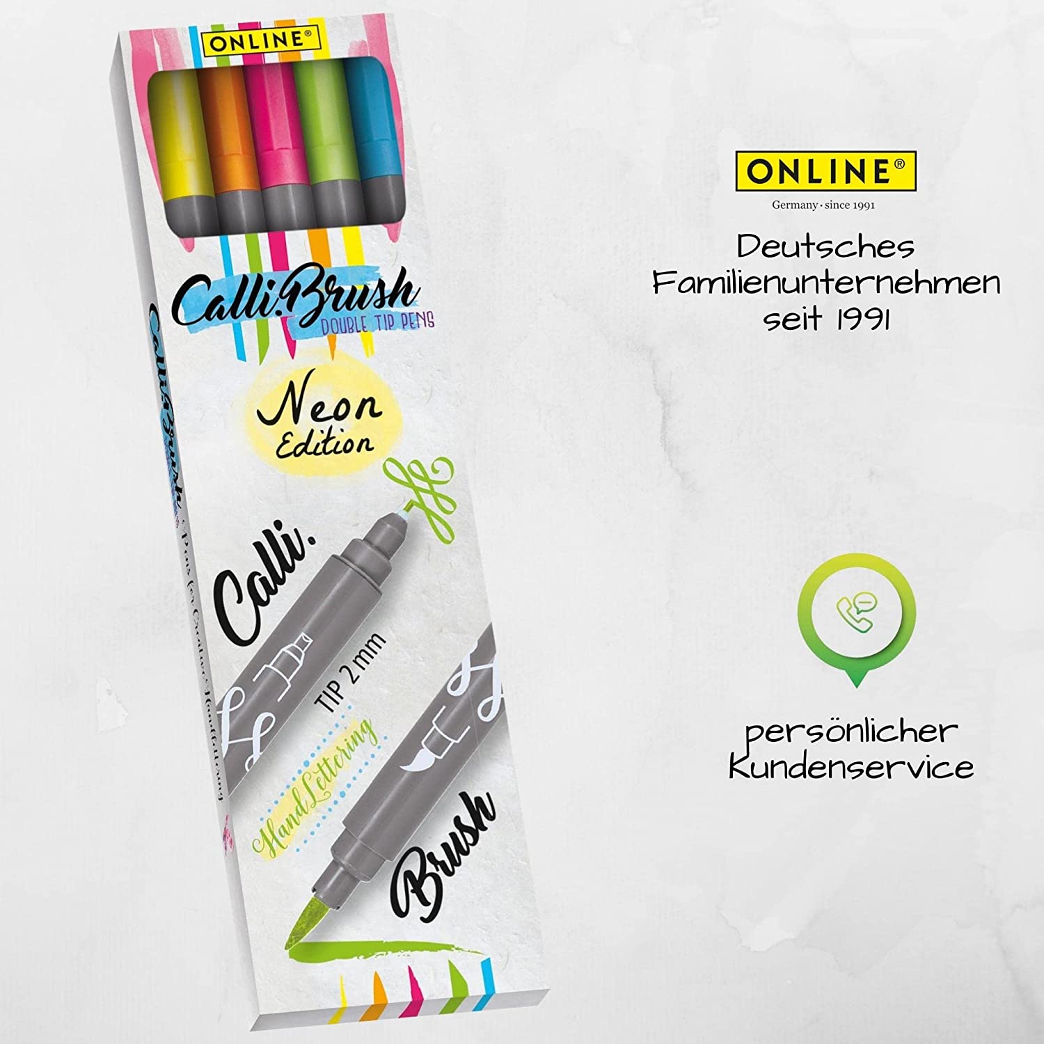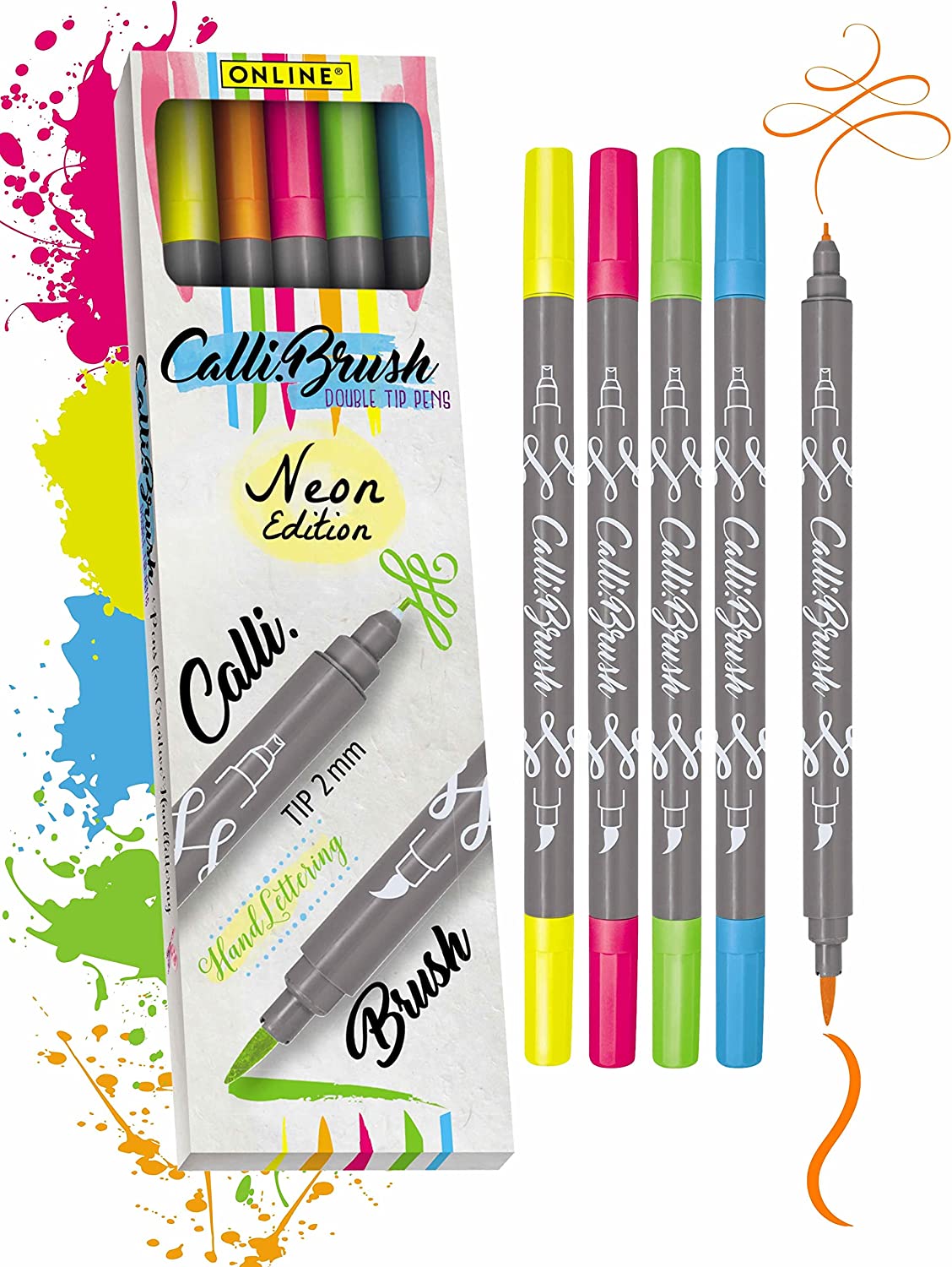 Calli.Brush Double Tip Pen for creative writing with calligraphy nib and brush nib, Set with 5 colours Content: Fluo Yellow, Fluo Pink, Light Blue, Fluo Green, Fluo Orange Suitable for beginners This set will increase your pleasure in creative activities involving writing, hand-lettering, art and drawing. All you need are these watercolour brush pens, a piece of paper and a little bit time. The main thing is to enjoy creating ideas and dip into the wonderful world of the handmade, like postcards, greeting cards, wedding invitations or birthday cards. The combination of the thin nib with the wide brush nib allows diverse and creative design. It is enjoyable – and these days, anything created by hand is especially appreciated. Excellent quality: Double tip with calligraphy nib and brush Calligraphy nib, 2 mm, for precise lining Flexible brush for creative writing & lettering Water-based ink Can be washed out of most textiles Safety by untoxic pigments Most useful for: Beginner Hand-lettering and calligraphy Creative writing and designing Colouring your artworks Relaxed artistic creation
