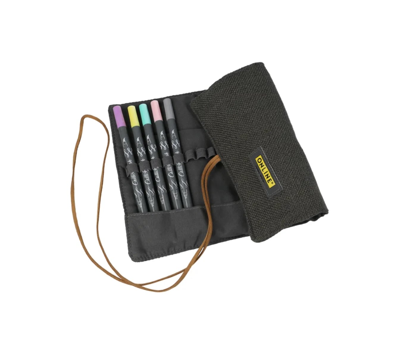 The Pen Roll with 5 Calli.Brush Double Tip Pens for creative writing Suitable for beginners The combination of the thin, angled nib with the wide brush nib allows diverse and creative design. The Calli.Brush Pens are for creative writing with calligraphy nib and brush nib and will increase your pleasure in creative activities involving writing, hand-lettering and lots of other possibilities. The main thing is to enjoy creating ideas and dip into the wonderful world of the handmade. The combination of the thin, angled nib with the wide brush nib allows diverse and creative design. It is enjoyable – and these days, anything created by hand is especially appreciated. The round Roll is made from textiles – a pleasant look and feel, functional fastener and a safe place for lots of different pens. The ideal accessory for anyone who loves writing, regardless of age. Excellent quality: Double tip with calligraphy nib and brush Calligraphy nib, 2 mm, for precise lining Flexible brush for creative writing & lettering Water-based ink Can be washed out of most textiles Safety by untoxic pigments Are most useful for: Beginner Hand-lettering and calligraphy Creative writing and designing Colouring your artworks Relaxed artistic creation