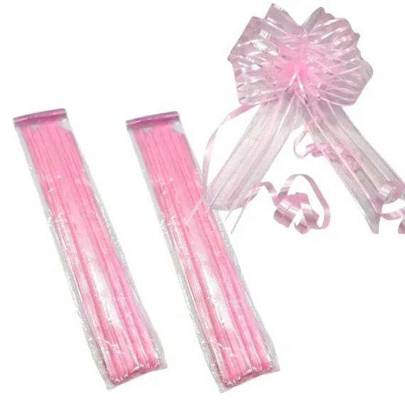 Specificatii: Fundite rapide preformate din organza roz, sistem pull-bow, dimensiune banda 5x74 cm, set de 10 bucati