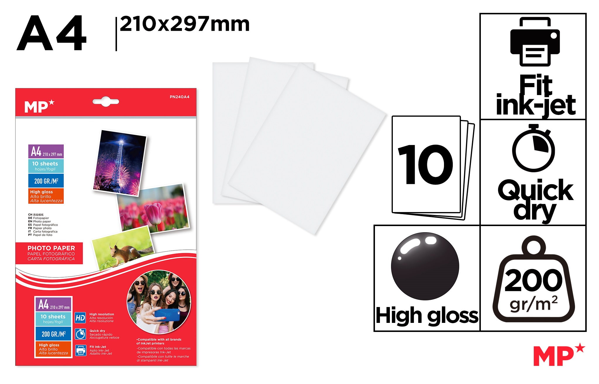 Photographic paper for ink-jet printers. Fast inkdrying.High gloss for printing photos or documentswithimages that require a high level presentation,bothfor color and black and white. Images aresharpand with a glossy finish. Single-sided use.200g/m2 paper. A4 size. Sheet measurements: 297 x210.Pack of 10 sheets.