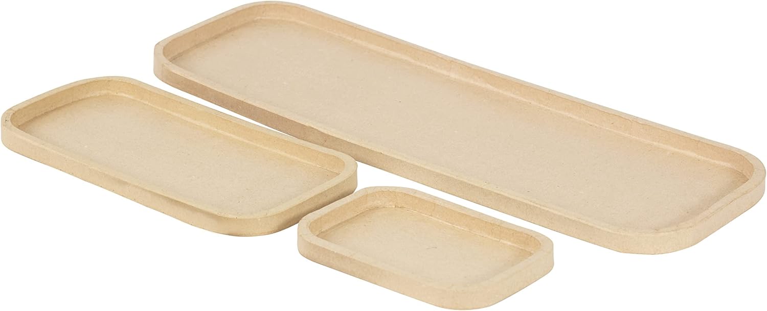 Acest set de 3 tăvi dreptunghiulare este perfect pentru pasionații de artă și decorațiuni interioare care doresc să își personalizeze propriile accesorii. Tăvile sunt realizate manual din papier mâché maro (kraft), fiind unice.