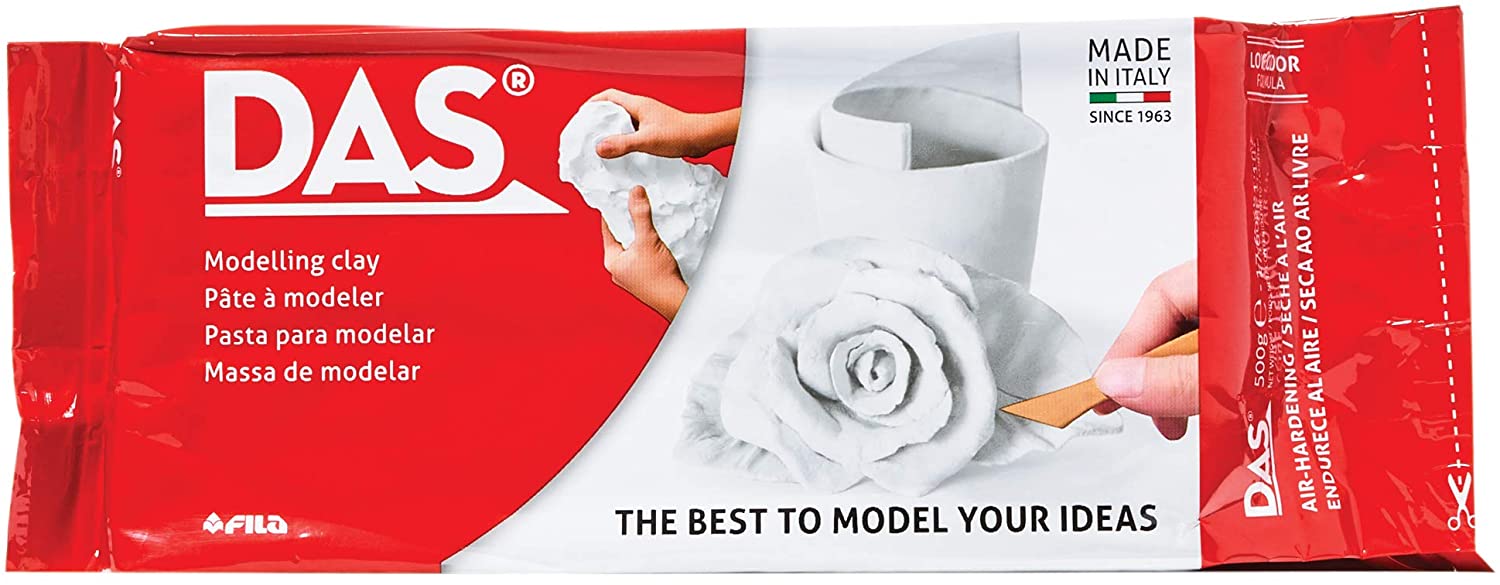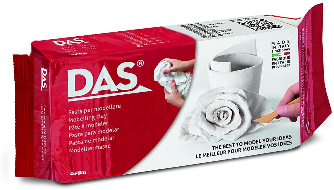 Din 1963, DAS a fost cel mai faimos și foarte utilizat material de modelare auto-întărire din lume. Este pe bază de minerale, testat dermatologic și fără gluten și nu trebuie să fie ars, deoarece se întărește când este expus la aer. Este ușor de lustruit și vă permite să creați obiecte solide, rezistente, care pot fi personalizate și decorate după preferințele dvs., folosind vopsele sau carioci. Este deosebit de versatil și poate fi folosit pentru a acoperi o gamă largă de suprafețe, cum ar fi lemn, plastic, metal, sticlă etc. Disponibil în alb sau în teracotă. Vine în pachete de folie de aluminiu, care îi ajută să-și păstreze prospețimea pentru o lungă perioadă de timp, cu o bandă care poate fi reaplicabilă pe spate