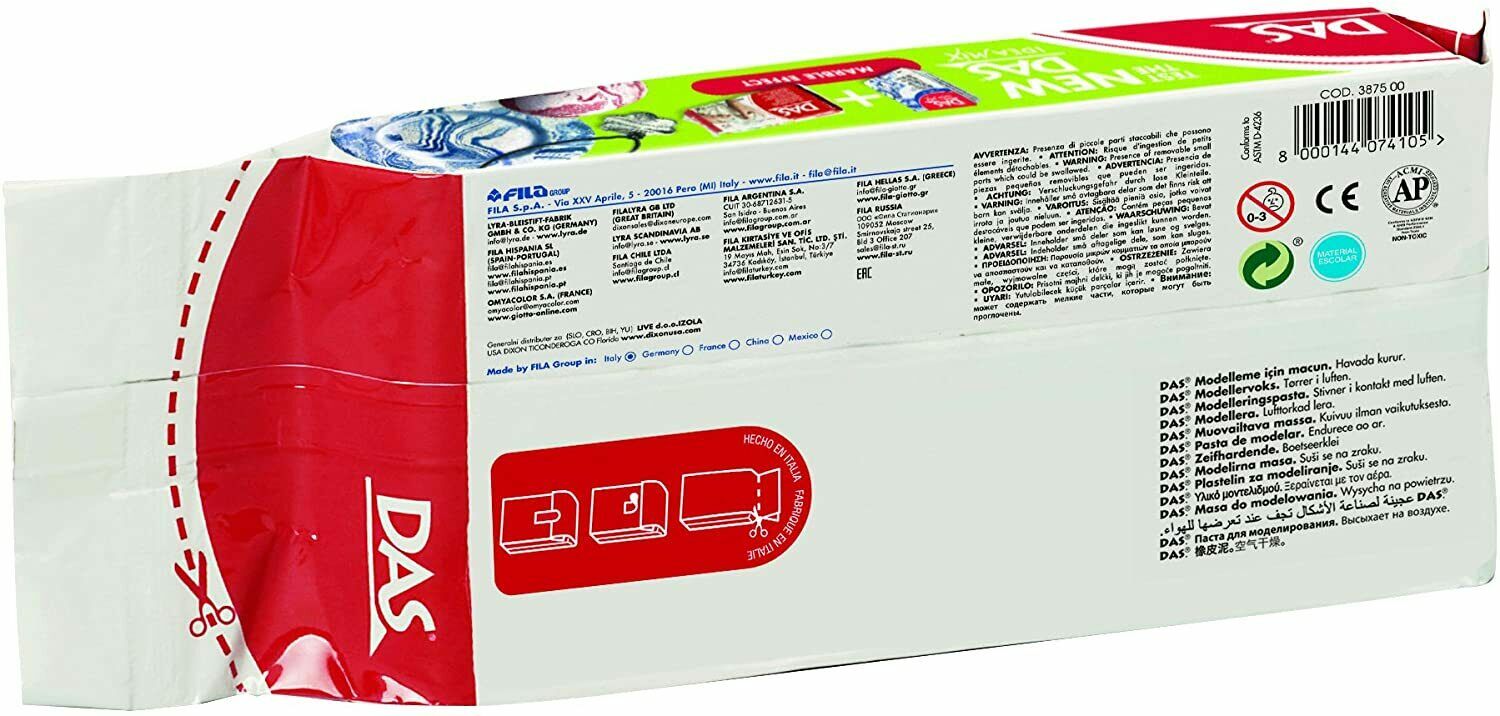 Din 1963, DAS a fost cel mai faimos și foarte utilizat material de modelare auto-întărire din lume. Este pe bază de minerale, testat dermatologic și fără gluten și nu trebuie să fie ars, deoarece se întărește când este expus la aer. Este ușor de lustruit și vă permite să creați obiecte solide, rezistente, care pot fi personalizate și decorate după preferințele dvs., folosind vopsele sau carioci. Este deosebit de versatil și poate fi folosit pentru a acoperi o gamă largă de suprafețe, cum ar fi lemn, plastic, metal, sticlă etc. Disponibil în alb sau în teracotă. Vine în pachete de folie de aluminiu, care îi ajută să-și păstreze prospețimea pentru o lungă perioadă de timp, cu o bandă care poate fi reaplicabilă pe spate