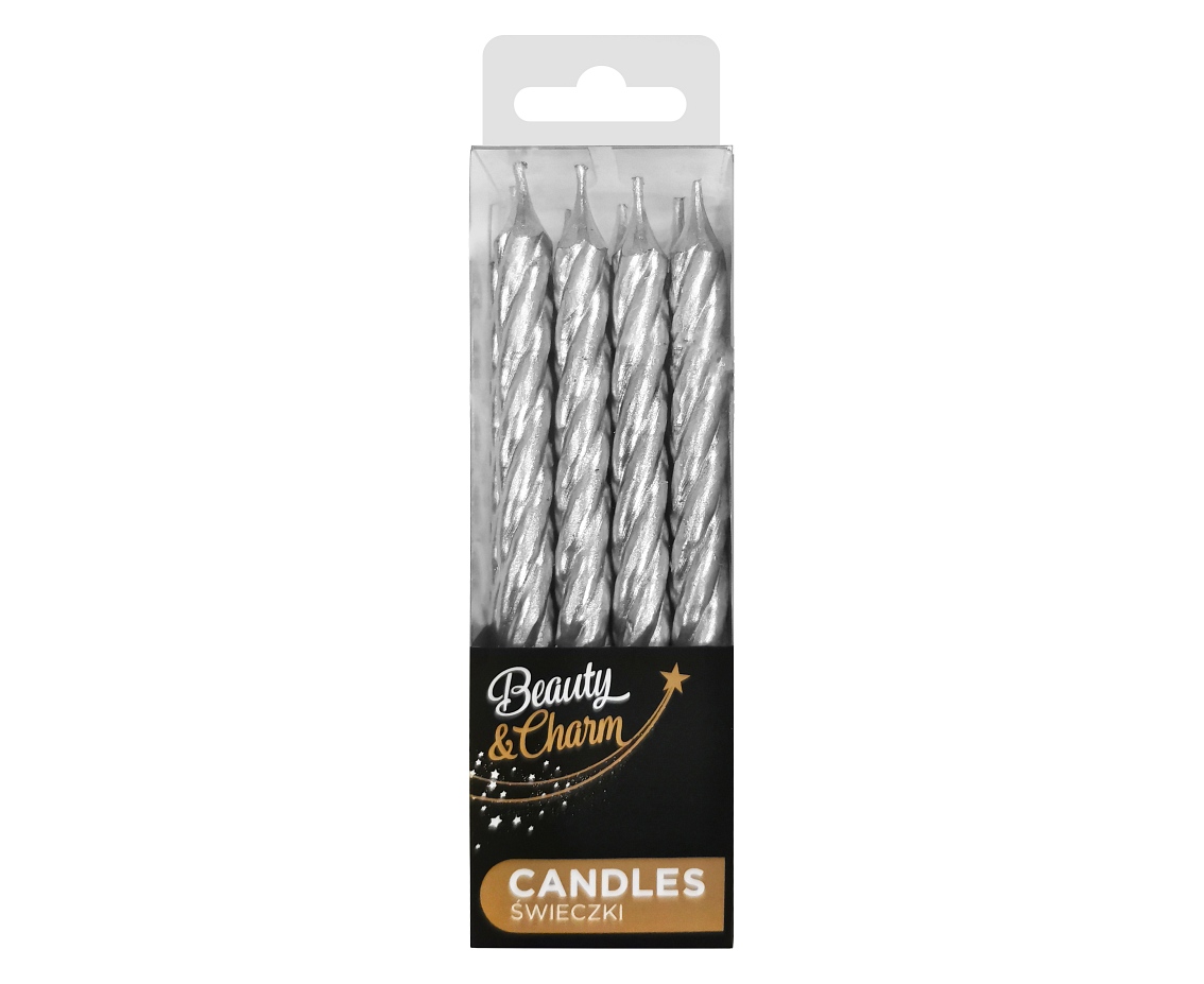 Lumanari argintii pentru un tort. Coastele convenabile vă vor permite să le așezați cu ușurință pe tort. Culoarea frumoasă și o formă răsucită unică fac ca aceste lumânări să atragă chiar și pe cei mai pretențioși. Lumânările din colecția Beauty & Charm se disting prin eleganță și calitate înaltă a manoperei. Aprindeți-le la zile de naștere, nunți sau alte evenimente și aprindeți emoțiile!