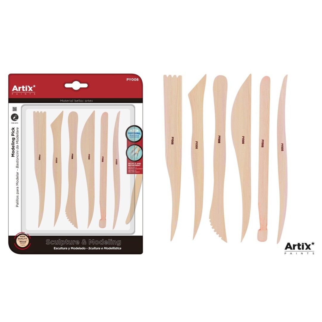 Spatule din lemn pentru modelare cu diferite finisaje la ambele capete. Sunt perfecte pentru sculpturi, modelare, crearea de detalii sau perfectionarea operelor de arta in argila, pasta de modelat, argila de modelat, aplicarea de vopsele groase, mixte etc. Usor de curatat. Set de 6 unitati.