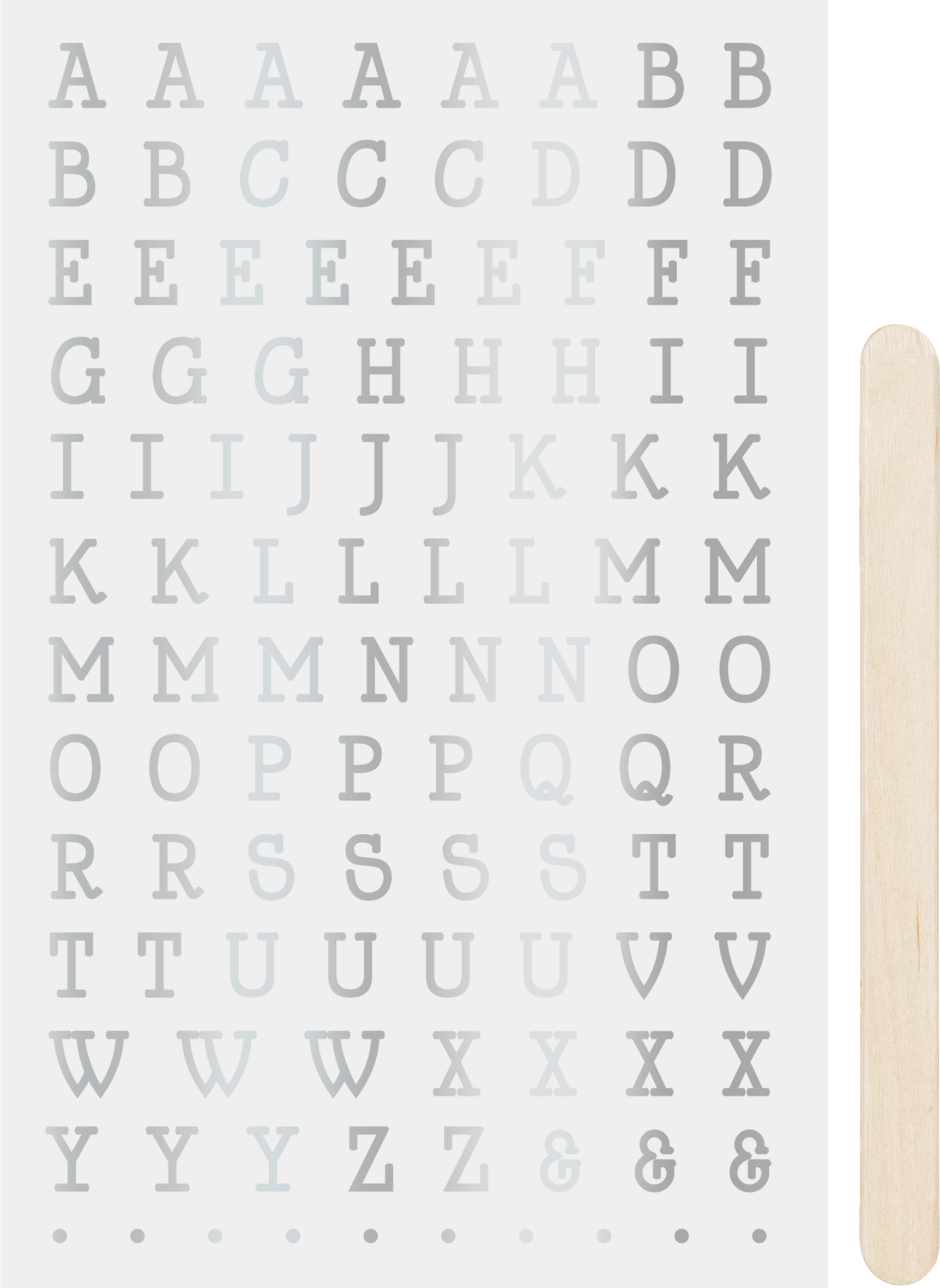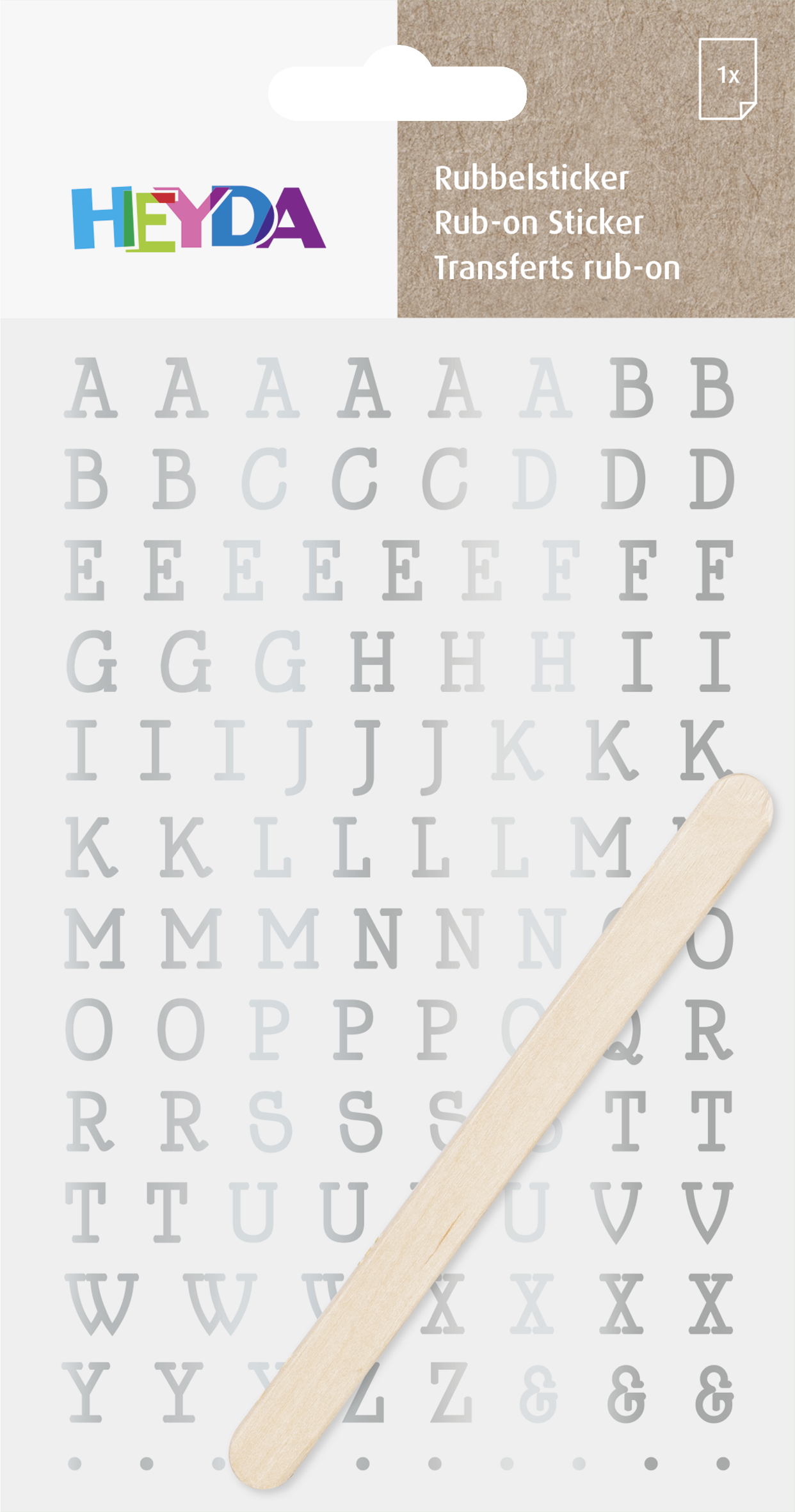 Ideal for decorating paper & cardboard, also transferable to smooth surfaces such as glass, porcelain, wood and many more for decorative purposes 10 x 19 cm 1 motif sheet, 1 wooden stick Alphabet 2 silver glossy with instructions not dishwasher safe in a resealable pouch with euro slot cut out the motifs, peel off the backing film, put in place and transfer by rubbing on easy decorating but with excellent optical appearance for various materials