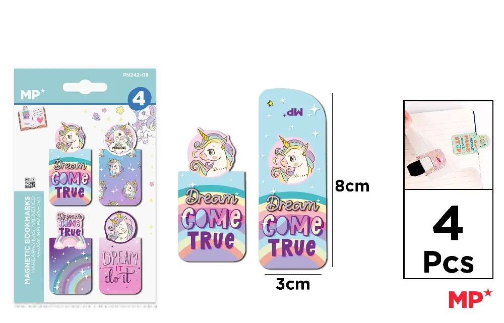 • Set de 4: Setul include 4 semne de carte magnetice, astfel încât să poți marca mai multe pagini în același timp sau să împarți cu prietenii.