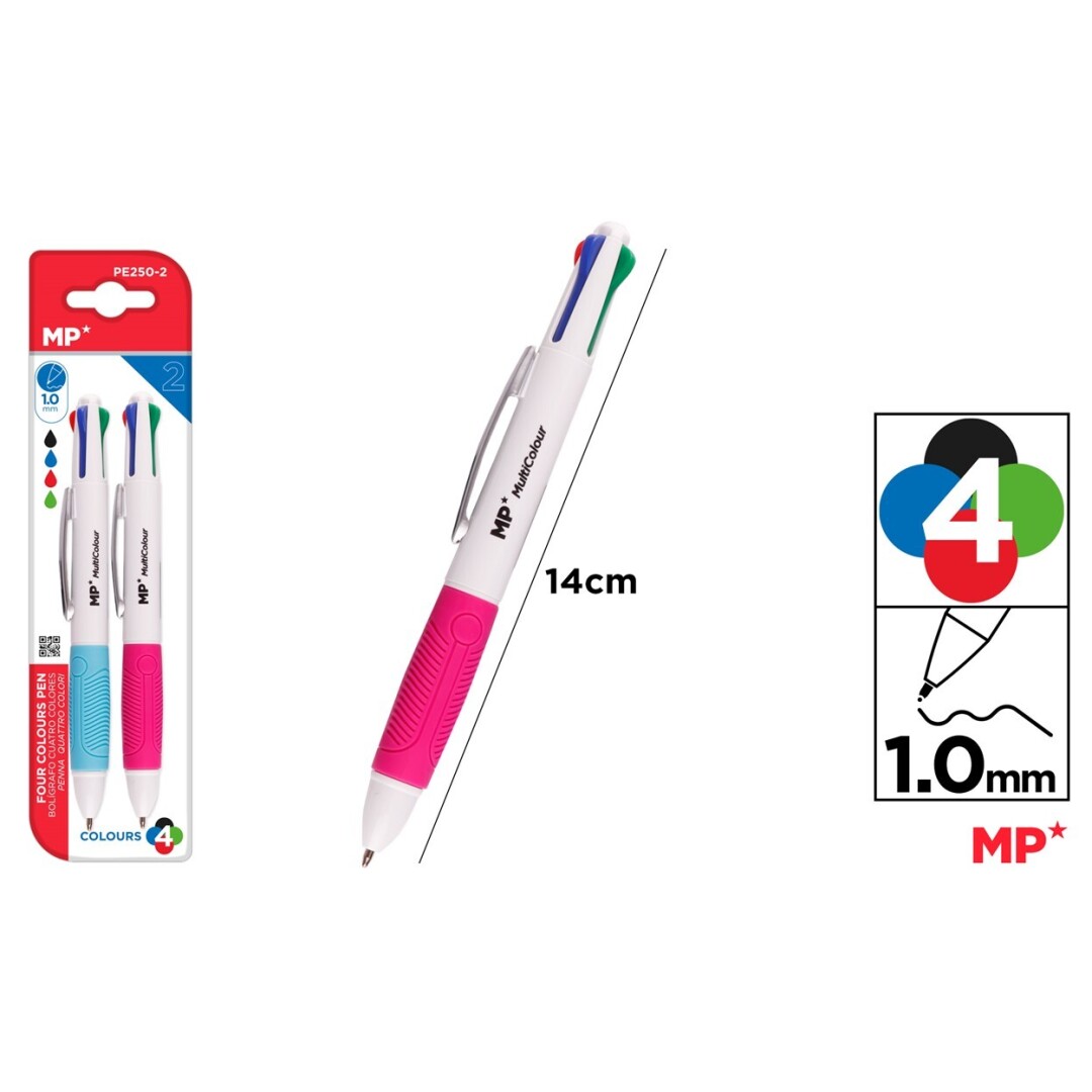 Pix cu sistem de clic retractabil în 4 culori (albastru, negru, roșu și verde) cu vârf de 1 mm. Corp din plastic alb. Clemă de prindere și mâner de cauciuc în roz sau albastru pentru un confort de scris mai bun. Dimensiune 140 mm. Blister de 2 unitati.