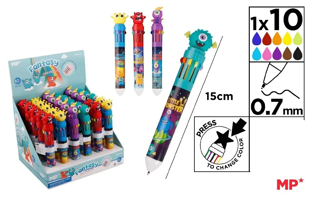 Pix IPB 10 Culori Fantasy Monstrii PE253-32 este un pix inovator și jucăuș, ideal pentru cei care doresc să adauge un strop de distracție și culoare în scris și desen. Cu un design tematic inspirat de monstruleți, acest pix oferă 10 culori diferite de cerneală pentru o experiență creativă unică.