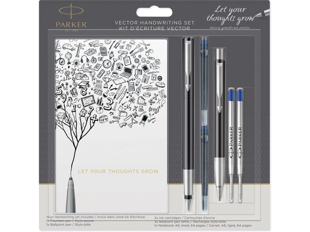 Descoperiți eleganța și performanța într-un singur set cu Parker Vector. Acest set complet include tot ce aveți nevoie pentru a vă exprima creativitatea și pentru a vă face notițe cu stil.