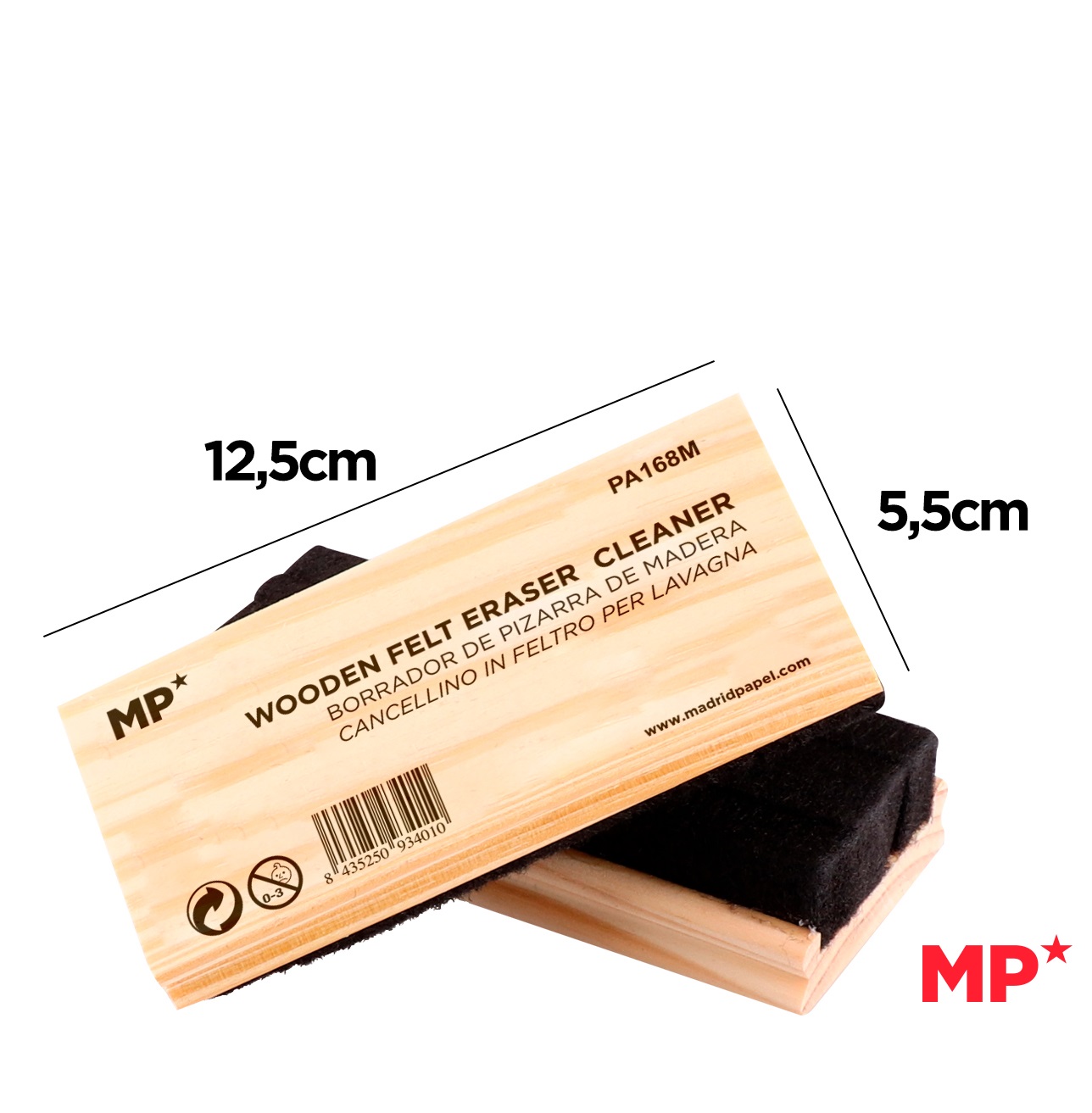 Felt eraser for both black (chalk) and white (whiteboardmarkers) boards. Wooden handle. Measurements:55 ?— 125 mm.