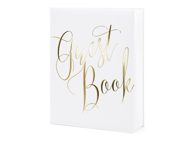 Guest book bound in white paper with a gold inscription, size approx. 20 x 24.5 cm 22 pages, without text.