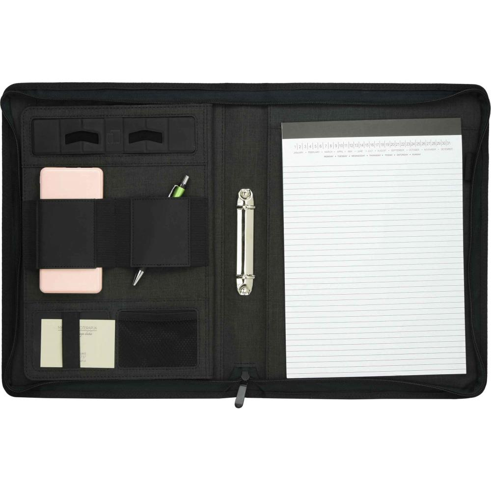 🗂️ Include un organizator elastic pentru dispozitive mobile și cabluri, plus o bandă decorativă din PU pentru transfer termic, personalizabil pentru branding sau evenimente corporate