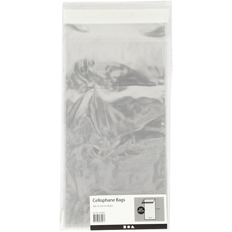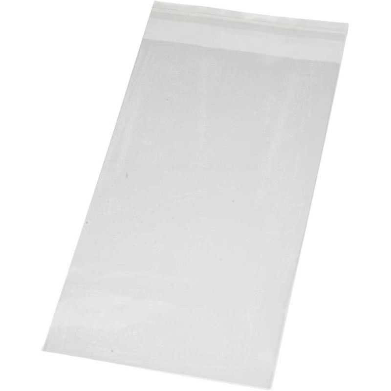 Transparent cellophane bags with self-adhesive flap. Measurements indicated outer and closed bag