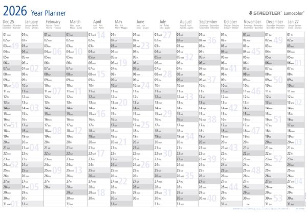 📦 PLANNER ANUAL STAEDTLER LUMOCOLOR – A1 (641 YP) 2026 ⭐ Plannerul anual STAEDTLER Lumocolor (Cod 641 YP) este un dispozitiv profesional, ergonomic și de înaltă calitate, conceput pentru a face planificarea și monitorizarea obiectivelor anuale rapidă, eficientă și precisă. Este un instrument indispensabil pentru birouri, școli sau utilizare casnică, oferind o viziune de ansamblu clară asupra întregului an.