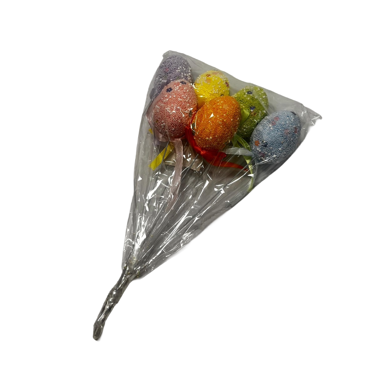 Adaugă un plus de înălțime și culoare aranjamentelor tale festive cu setul de ouă pe băț din polistiren, un accesoriu esențial pentru decorul de primăvară disponibil pe ipb.ro. Acest set de 6 piese este conceput pentru a oferi o notă ludică și rafinată buchetelor de flori sau ghivecelor de interior. Cu o lungime totală de 24 cm, aceste decorațiuni permit evidențierea simbolurilor pascale deasupra frunzișului plantelor, creând un efect vizual dinamic și vesel, ideal pentru a marca sărbătoarea renașterii naturii.