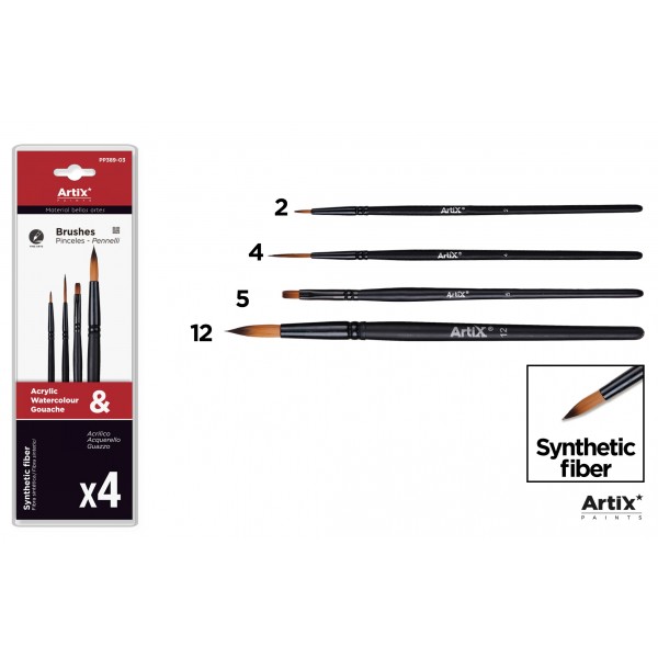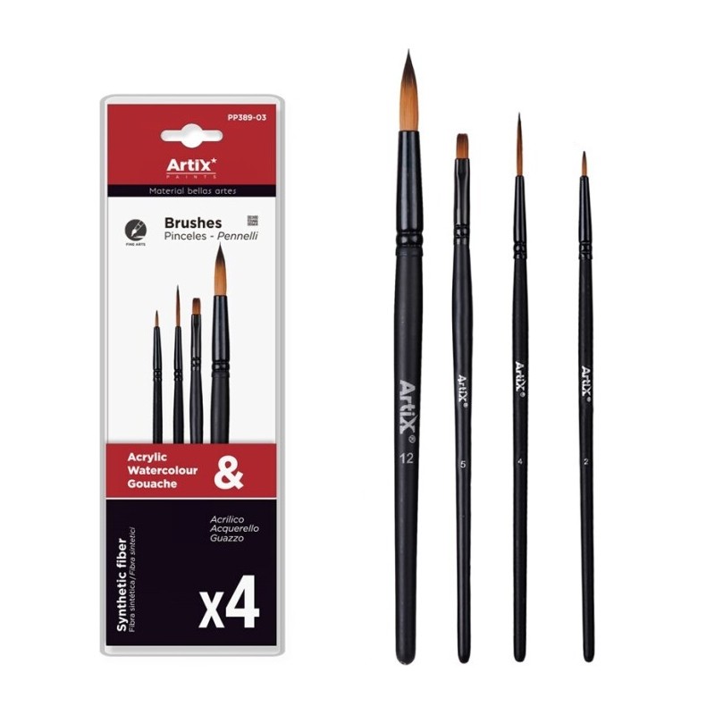 Set pensule profesionale din par sintetic, cu coada scurta, varf liner, drept si rotund, Artix. Pensule rezistente potrivite pentru majoritatea tehnicilor de pictura, de la culorile acrilice, pana la acuarele, tempera sau guase. Acest tip de pensule sunt ideale pentru trasarea de linii subtiri, permit realizarea detaliilor, retusuri finale sau umplerea suprafetelor. Setul contine: 1 pensula cu varf liner nr. 4; 1 pensula cu varf drept nr. 5; 2 pensule cu varf rotund nr. 2, 12. Pretul se refera la un set de 4 pensule.