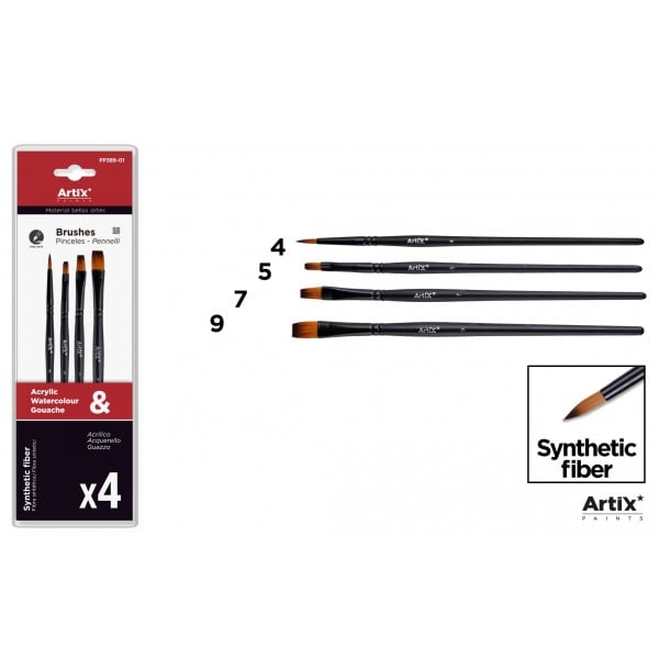 Set pensule profesionale din par sintetic, cu coada scurta, varf rotund si varf drept, Artix. Pensule rezistente potrivite pentru majoritatea tehnicilor de pictura, de la culorile acrilice, pana la acuarele, tempera sau guase. Acest tip de pensule sunt ideale pentru trasarea de linii groase pana la subtiri, permite realizarea detaliilor sau umplerea suprafetelor. Setul contine: 1 pensula cu varf rotund nr. 6 si 3 pensule cu varf drept nr. 5, 7, 9. Pretul se refera la un set de 4 pensule.