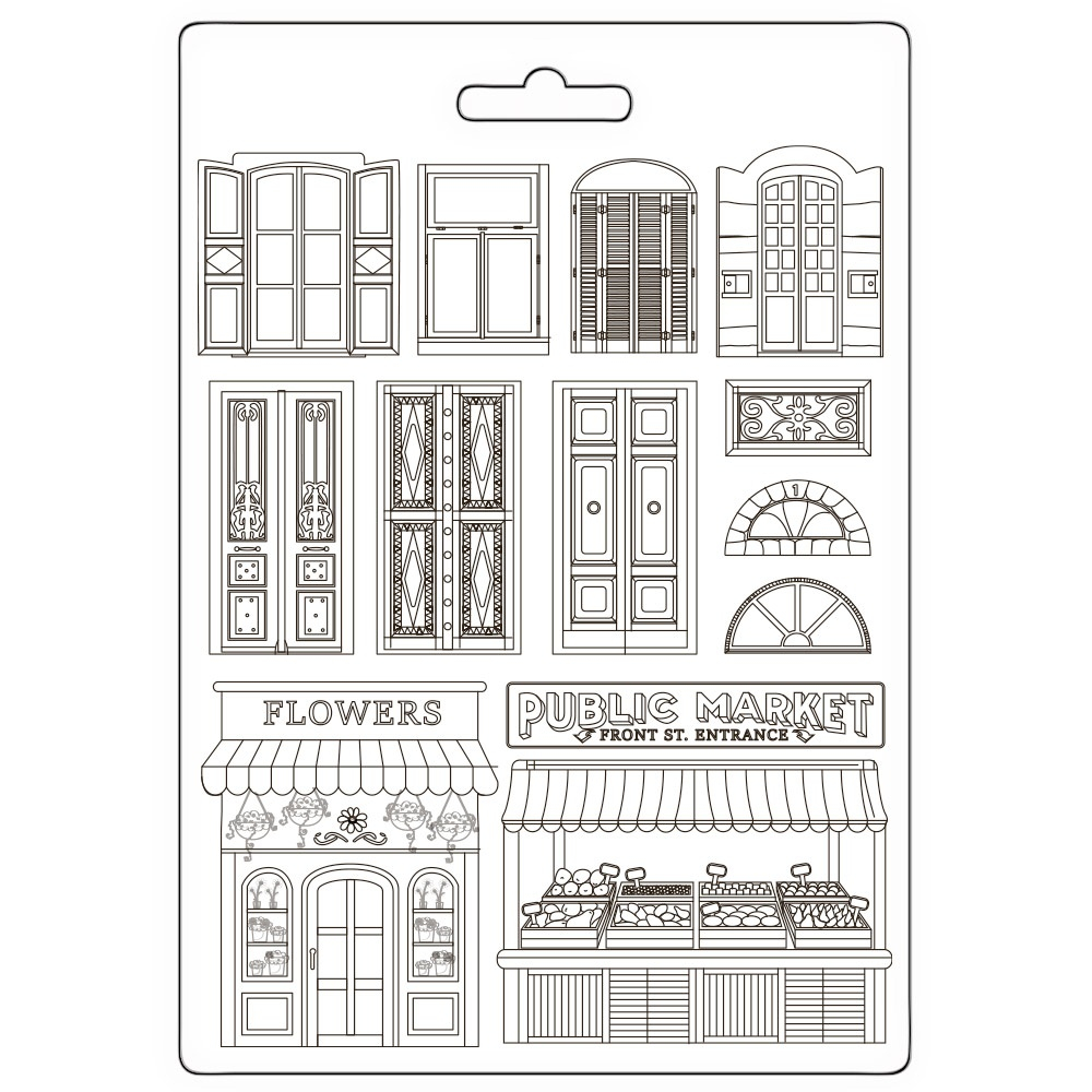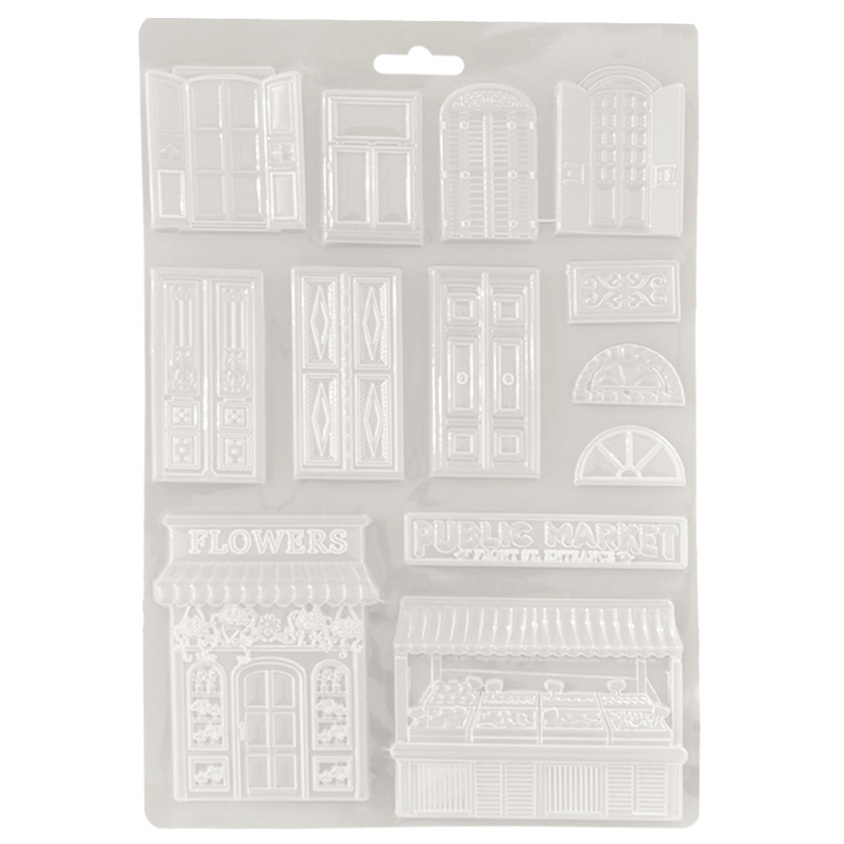 Această matriță profesională din silicon, cu tematica "Uși și Ferestre", face parte din colecția "Art of Traveling". Este ideală pentru a crea elemente arhitecturale miniaturale și scene urbane detaliate în proiectele dumneavoastră creative.