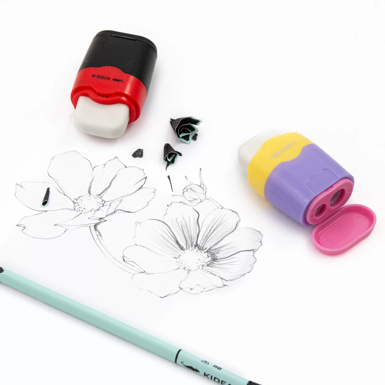 ✏️ Ascuțitoare dublă Kidea cu radieră, utilă pentru desen, schiță și studiu, compatibilă cu creioane de diferite grosimi, de la jumbo la subțiri.
