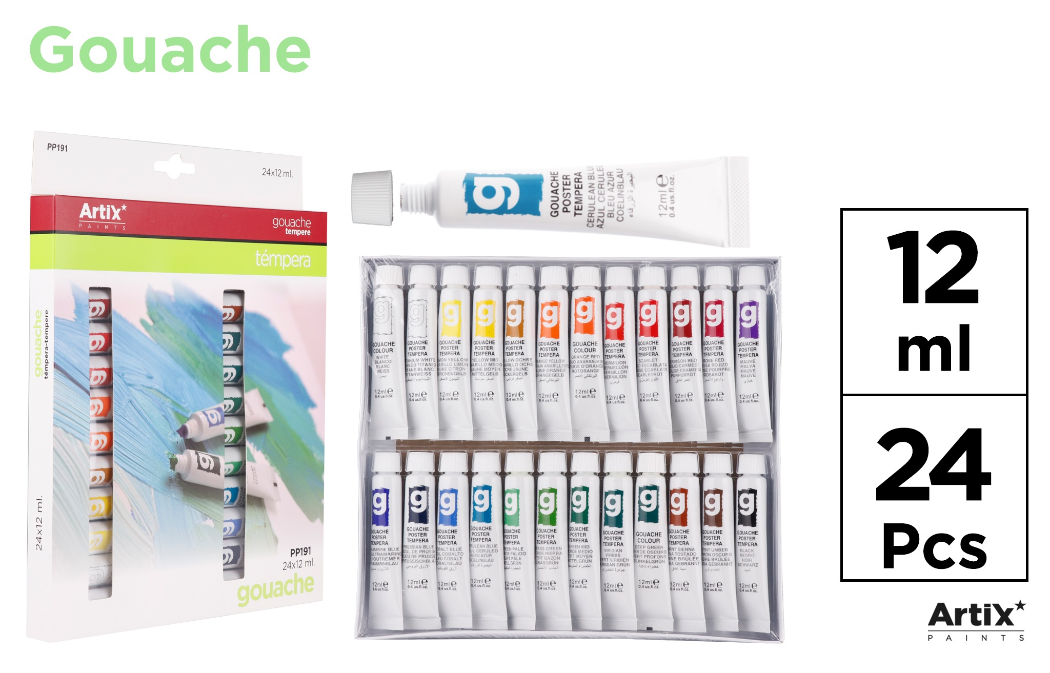 Set tempera Artix pentru pictura pe baza de apa, cu pigmenti de inalta calitate acoperire buna si rezistenta la lumina. Culori intense ce pot fi amestecte intre ele si permit diluarea cu apa. Nu se recomanda copiilor sub 3 ani, nesupravegheati. Setul contine 24 culori: alb, alb de titan, galben lamaie, galben, galben ocru, portocaliu-galben, portocaliu roscat, vermilion, rosu scarlet, rosu crimson , rosu rose, mov, albastru ultramarin, albastru prusia, albasru cobalt, albastru ceruleum, verde pal, verde iarba, verde mediu, viridian, verde inchis, sienna arsa, umbra arsa, negru. Pretul se refera la un set de 24 culori x 12 ml.