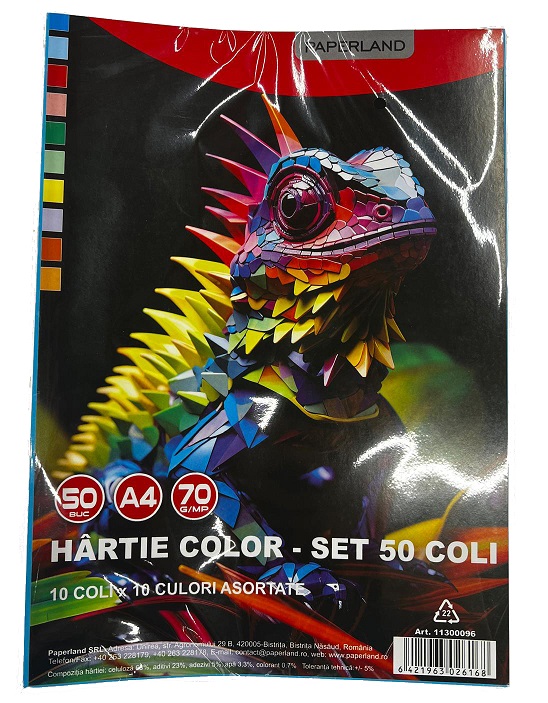 Set de hârtie colorată de dimensiune A4, care conține 10 culori diferite. Ideală pentru proiecte de artă, crafturi și activități educative. Pachetul include 50 de foi, câte 5 foi din fiecare culoare, oferind o gamă variată pentru toate nevoile creative.
