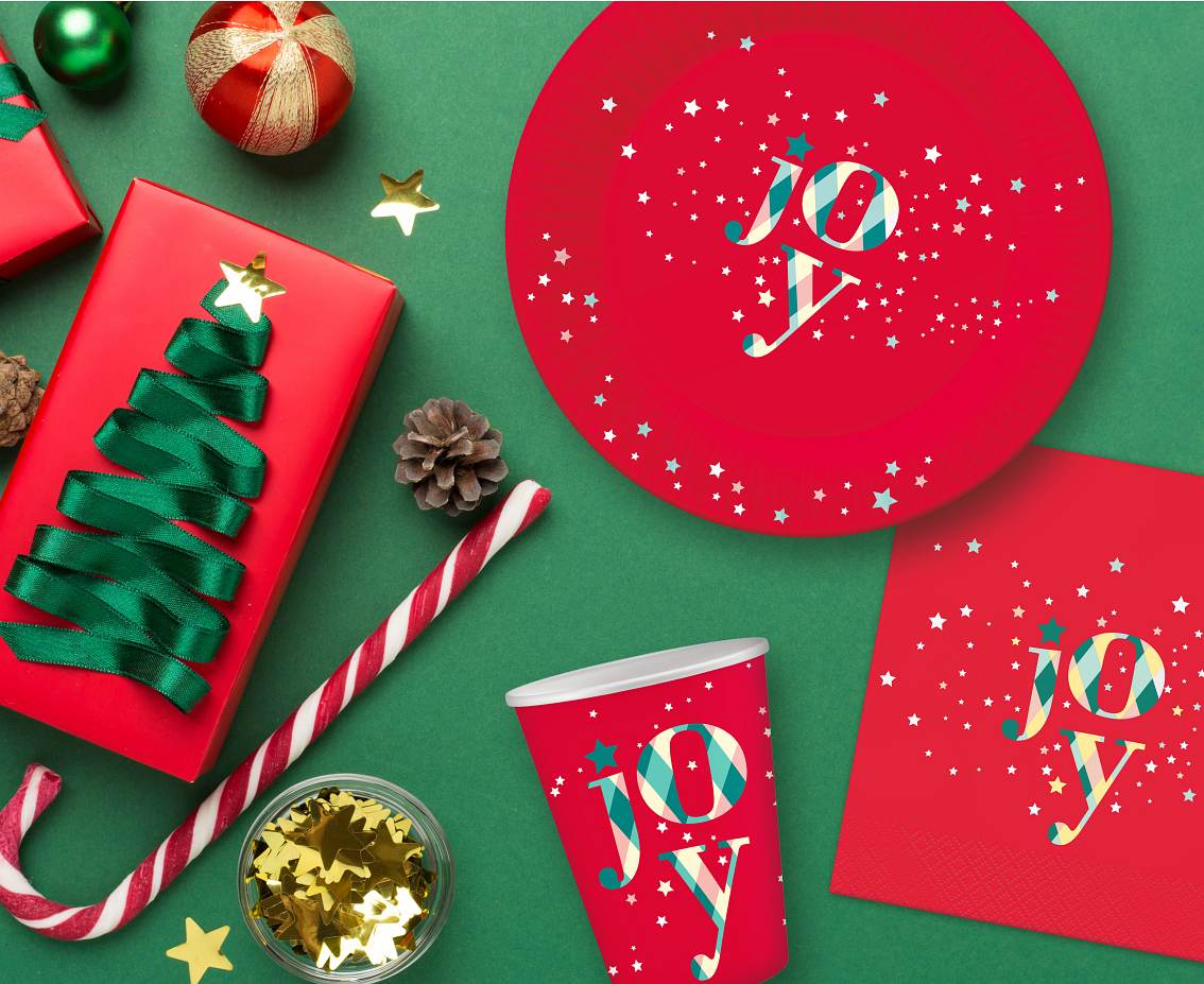 Colecția JOY reprezintă o fuziune între modernitate și un aer vesel, reflectată în fiecare detaliu al acestei game de produse, de la pahare, la șervetele și farfurii. Culoarea dominantă, roșu aprins, servește drept fundal pentru stelele albe și romburi colorate, creând o grafică plină de dinamism și expresivitate. Această colecție nu se potrivește doar oricărui tip de sărbătoare, ci se integrează cu succes și în atmosfera Crăciunului, aducând un accent fresh și modern în această perioadă specială. Cu JOY, fiecare eveniment devine mai vesel și mai deosebit.