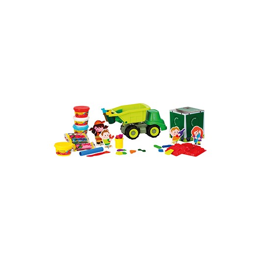 Creative set for the little ones Ideal for working with children on recycling values and caring for the environment Contains: 1 roller, 1 small knife, 3 plastic baskets, 4 pasta to play 100g (contains wheat flour) and 1 garbage truck, 1 cardboard container, 4 molds and pasta to play The play paste included in the set is dermatologically tested and washable