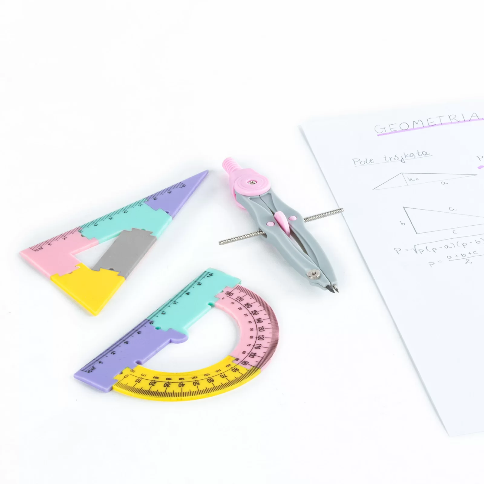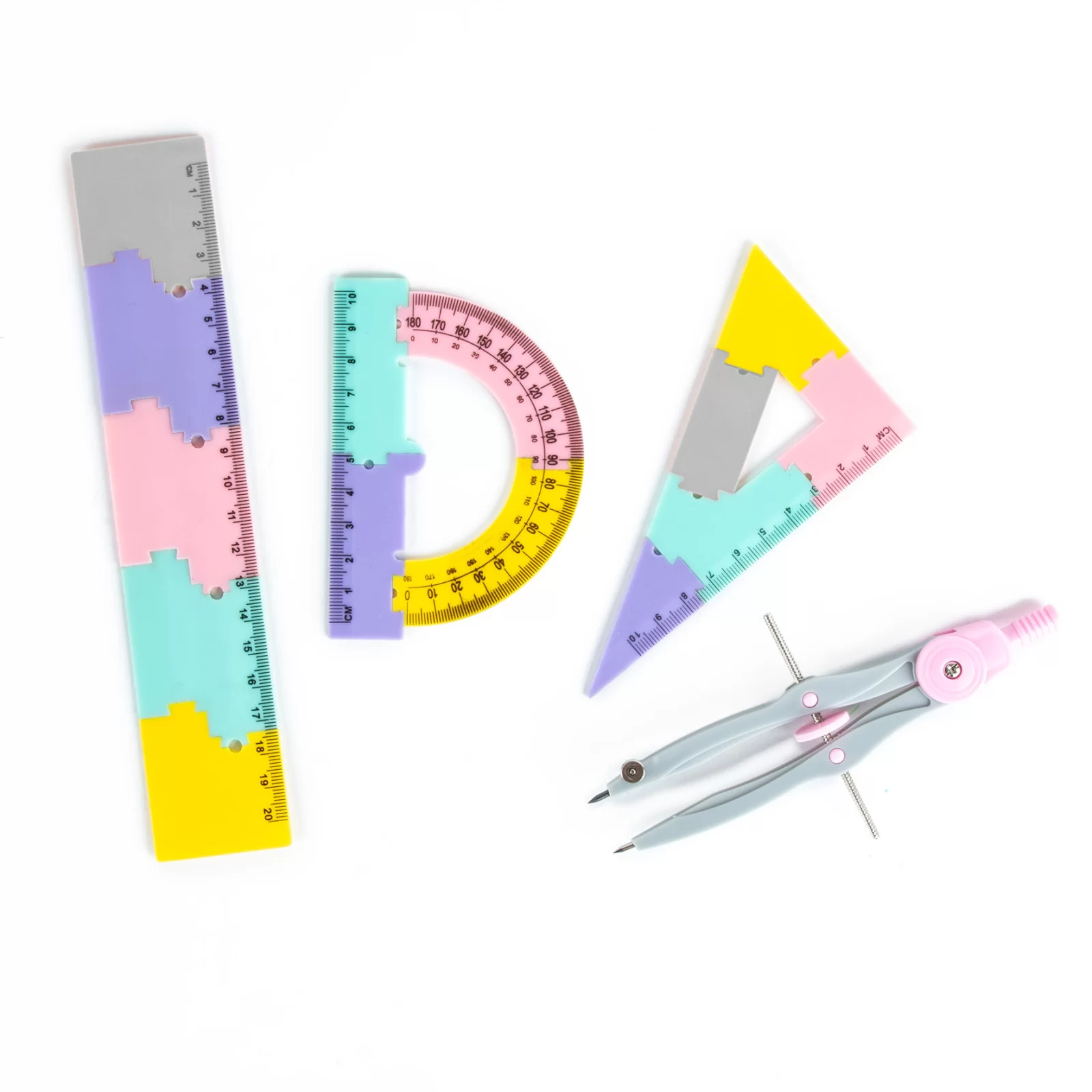 🌈 Conține patru elemente vibrante și ușor de utilizat: riglă de 20 cm, echer, raportor și compas cu stylus, în culori roz, violet, turcoaz, galben și gri.