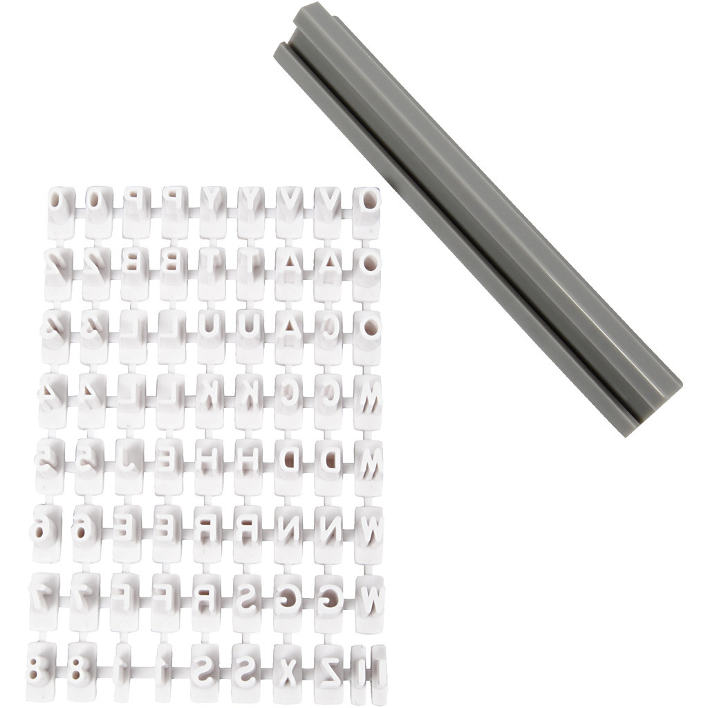Rubber stamps set with numbers and letters in hard plastic. Incl. holder. Can be used with many types of clay, Silk Clay and so on. Rinse the stamps in water immediately after use