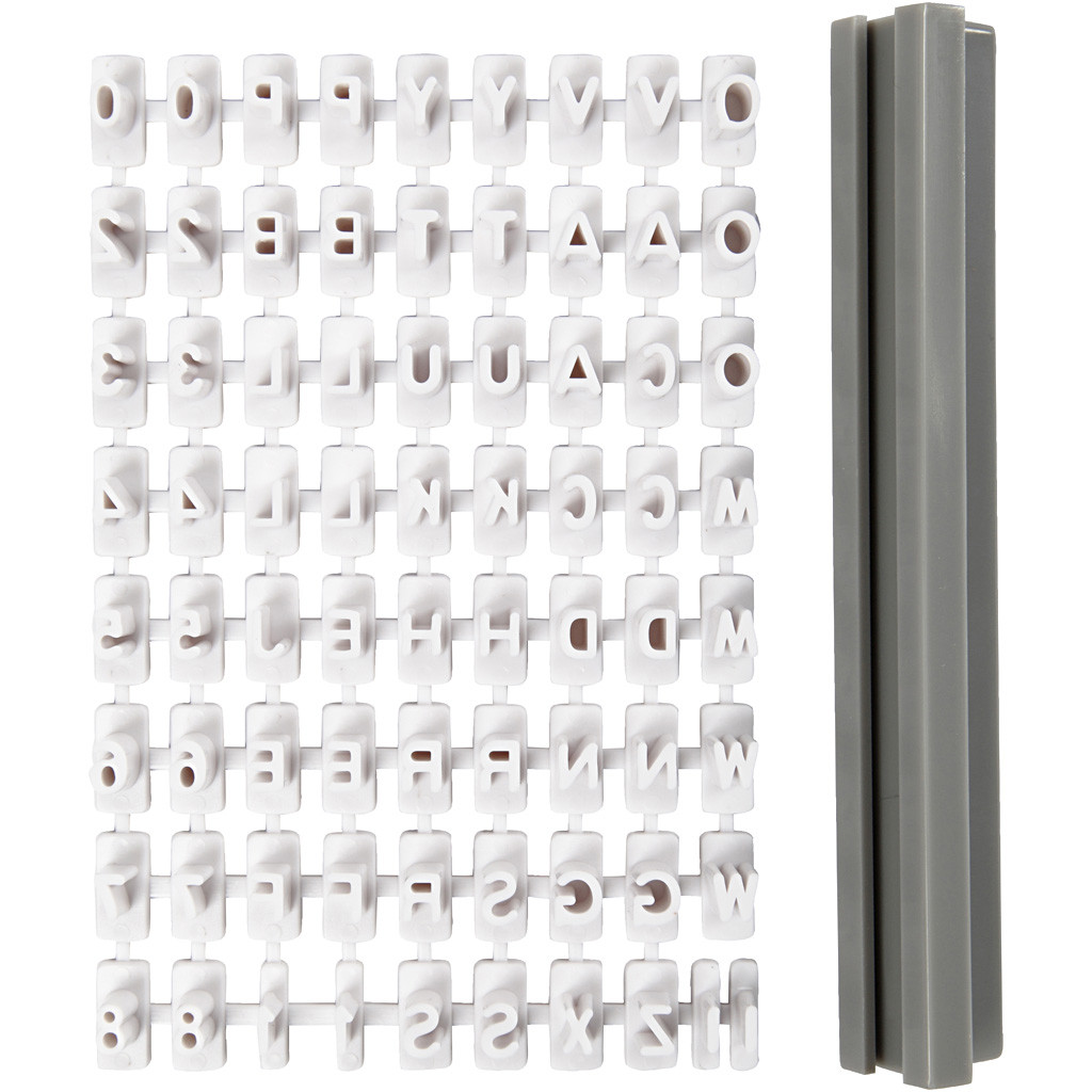 The set contains: 1 holder (12.6 cm long) and 85 characters (55 letters from A-Z, 18 numbers and 12 special characters)