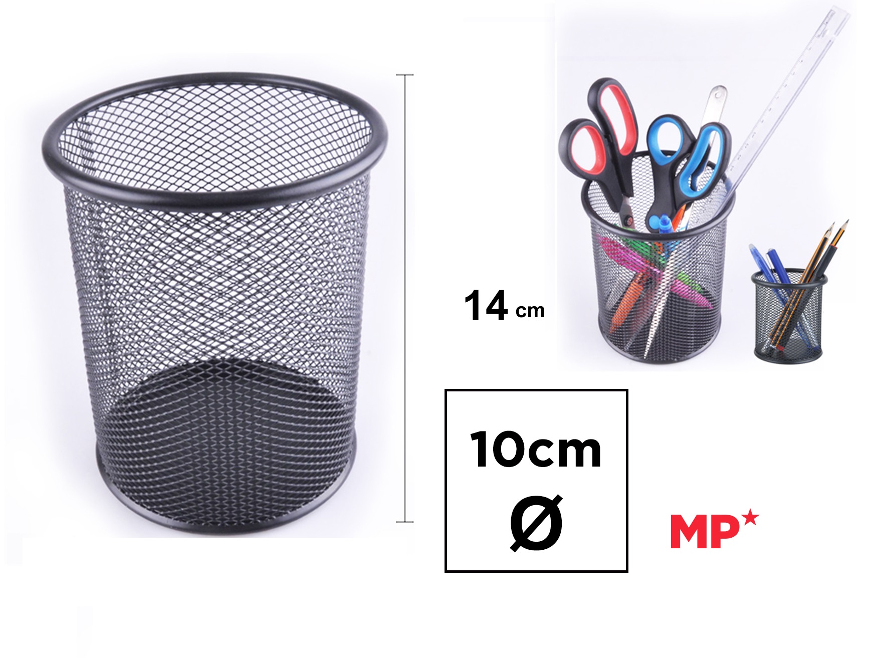 Suport pentru creion de birou din plasă metalică. Perfect pentru a organiza creioane, pixuri, markere, corectoare... și pentru a le ține la îndemână și ordonate.Rotund. 100 mm. 140 mm inaltime. Culoare neagra.