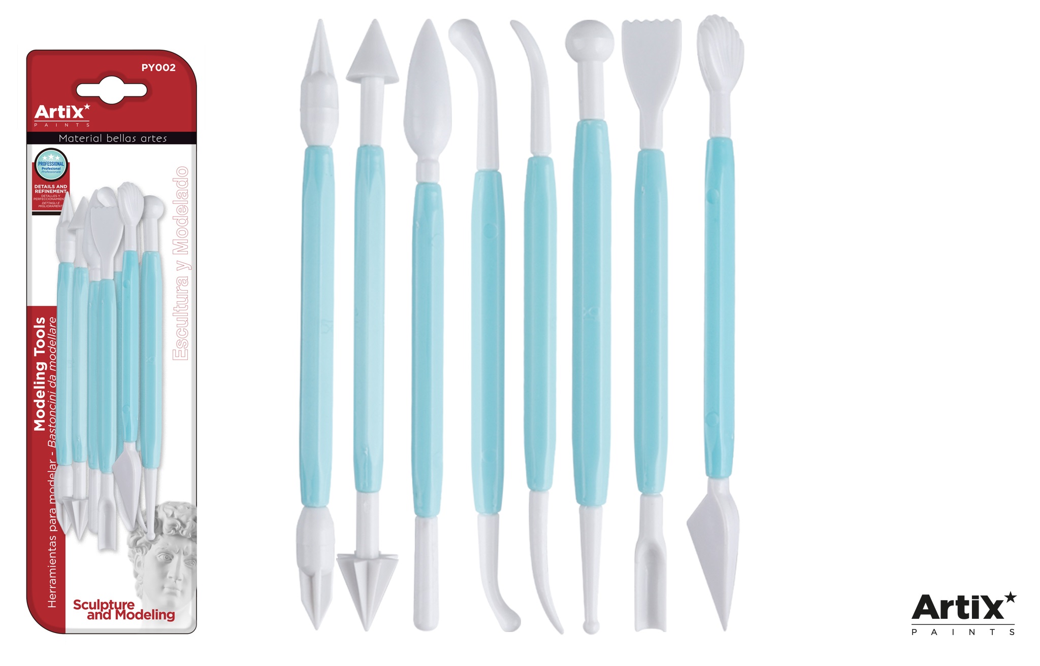 Spatule din plastic pentru modelare cu finisaje diferite la ambele capete. Sunt perfecte pentru sculpturi, modelare, crearea de detalii sau perfecționarea operelor de artă în argilă, pastă de modelat, argilă de modelat, aplicarea de vopsele groase, mixte etc. Ușor de curățat. Set de 8 unitati.