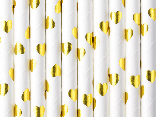 Paper straws, white with metallic gold hearts, length approx. 19.5 cm. The goods cannot be sold on the German and Swiss market due to the internal legal regulations of Germany and Switzerland. Goods comply with European Union regulations.