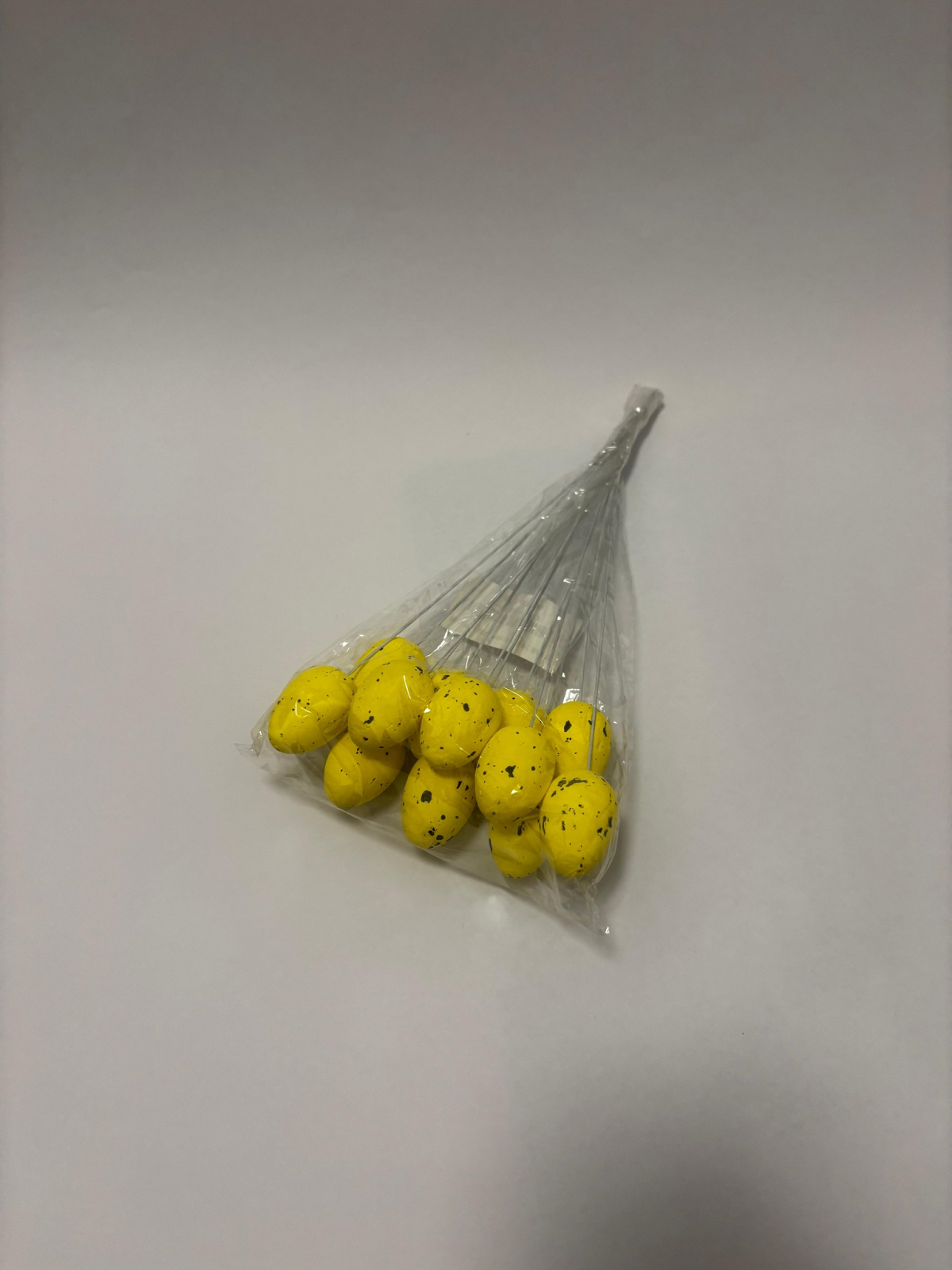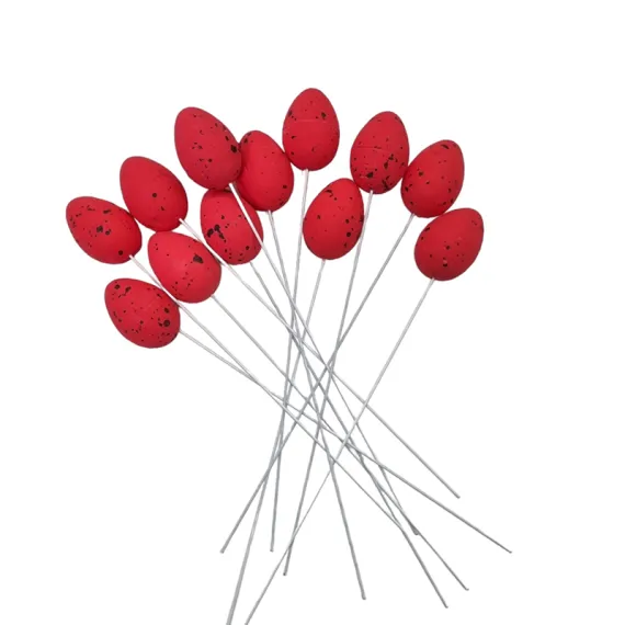 Ouăle pe băț din polistiren se integrează în aranjamentele florale de primăvară ca elemente de accent tematic și înălțime, completând florile cu volume decorative care depășesc structura floristică. În buchete de lalele galbene, ouăle galbene din set creează o compoziție monocromatică caldă și coerentă, în timp ce ouăle roșii adaugă un accent complementar energic. În buchete de narcise alb-galbene, ouăle roșii creează un contrast vibrant specific culorilor primare care produce un impact vizual imediat și festiv. Lalelele roșii combinate cu ouăle galbene din set produc o paletă cromatică inversată față de cea precedentă, la fel de echilibrată și atractivă. Aranjamentele cu zambile mov sau albastre beneficiază de ambele culori din set ca accente calde care contrabalansează tonurile reci ale florilor. Ramurile de forsythia galbenă în vaze înalte pot fi completate cu ouăle roșii pe băț inserate printre ramuri pentru o compoziție de primăvară completă și dinamică.
